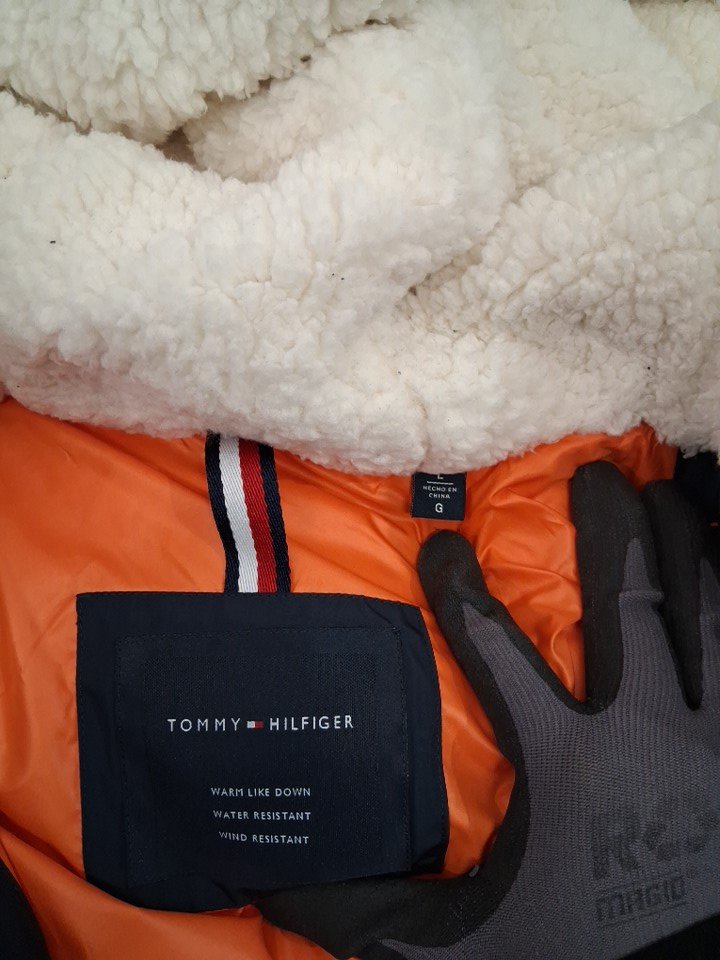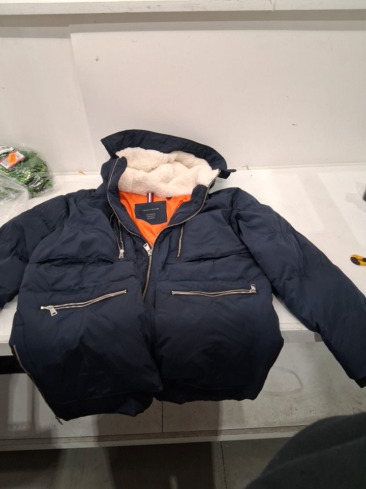 Mens TOMMY HILFIGURE hooded heavyweight parka jacket - Large - NAVY / white / orange