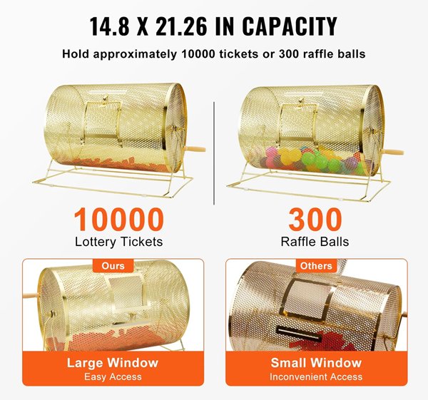 VEVOR Metal Lottery Spinning Raffle Drum with Wooden Turning Handle - Holds 10000 Tickets or 300 Ping Pong Balls - BRASS (MODEL: 25-ST)