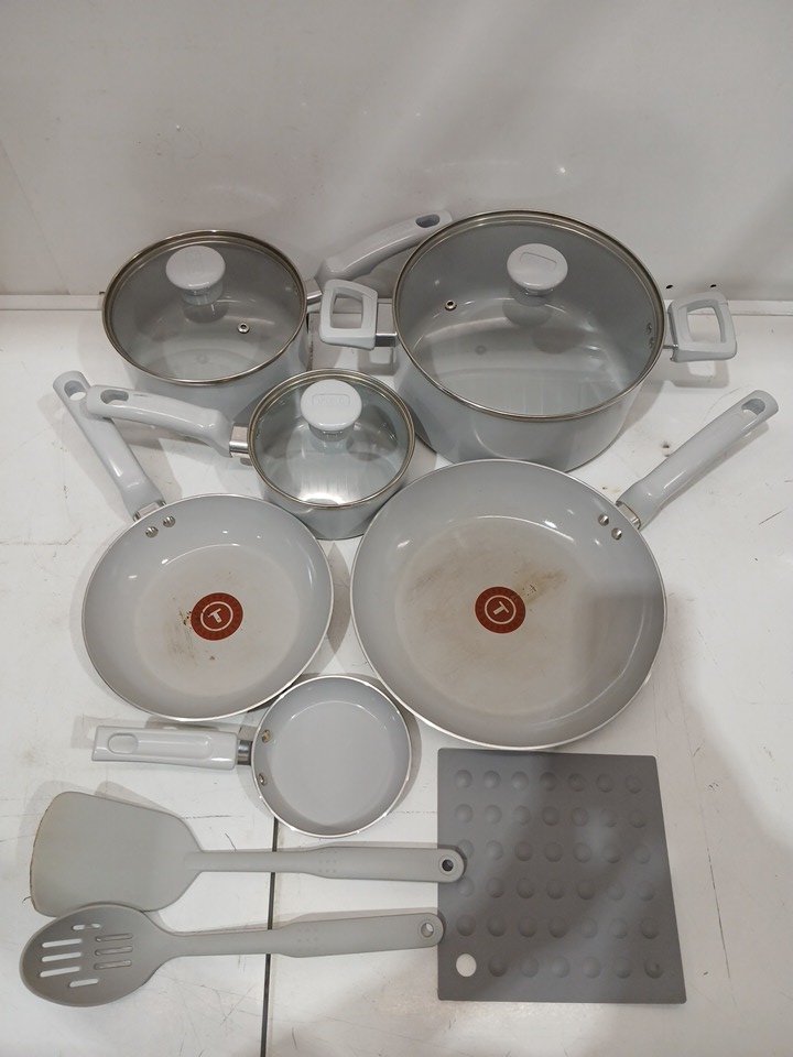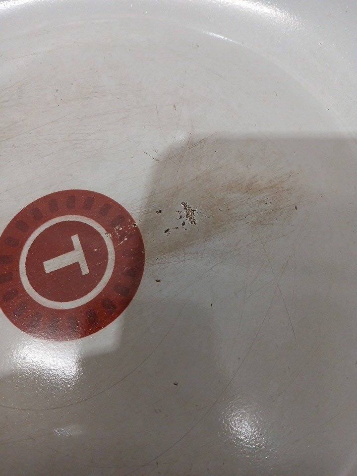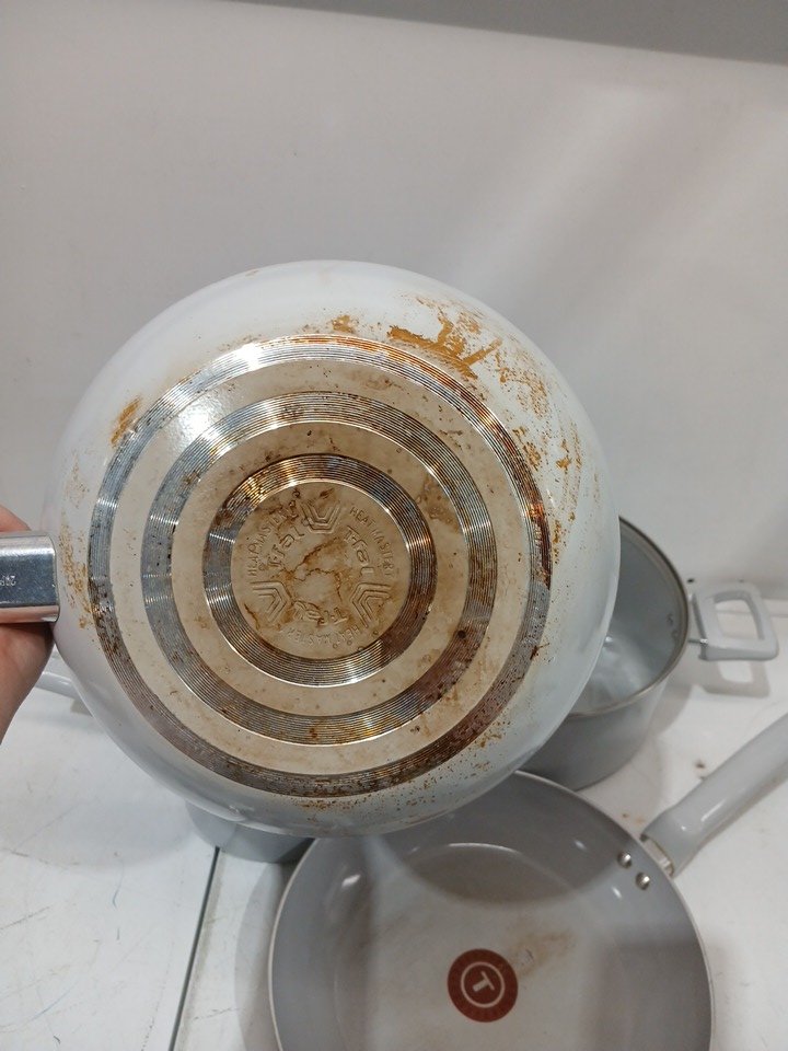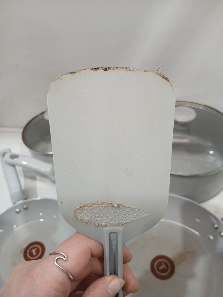 there is light scratching on the 2 bigger pans. there is residue present throughout due to previous use. the spatula has burn damage present