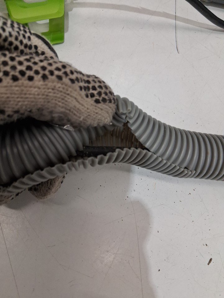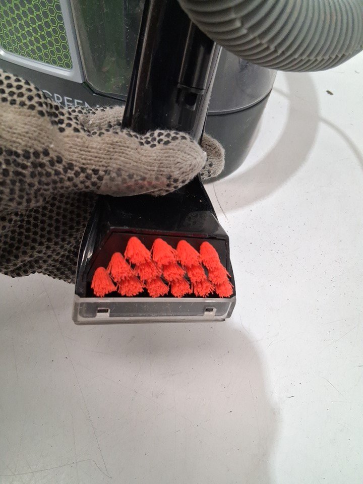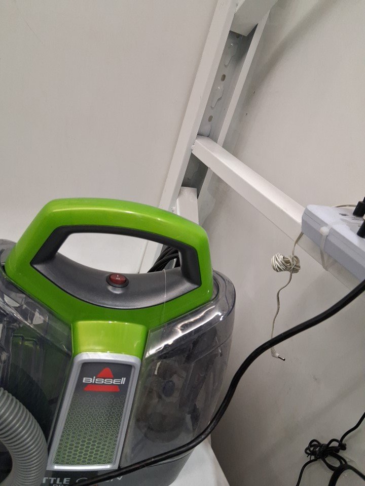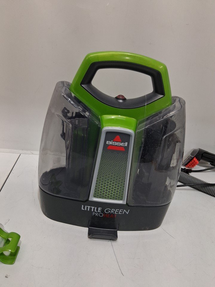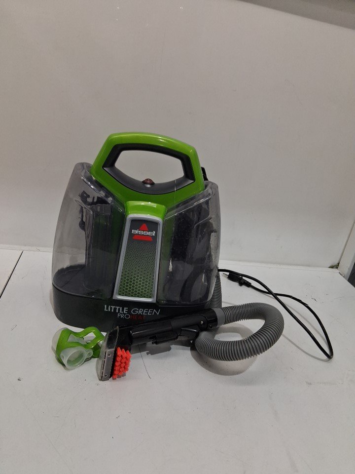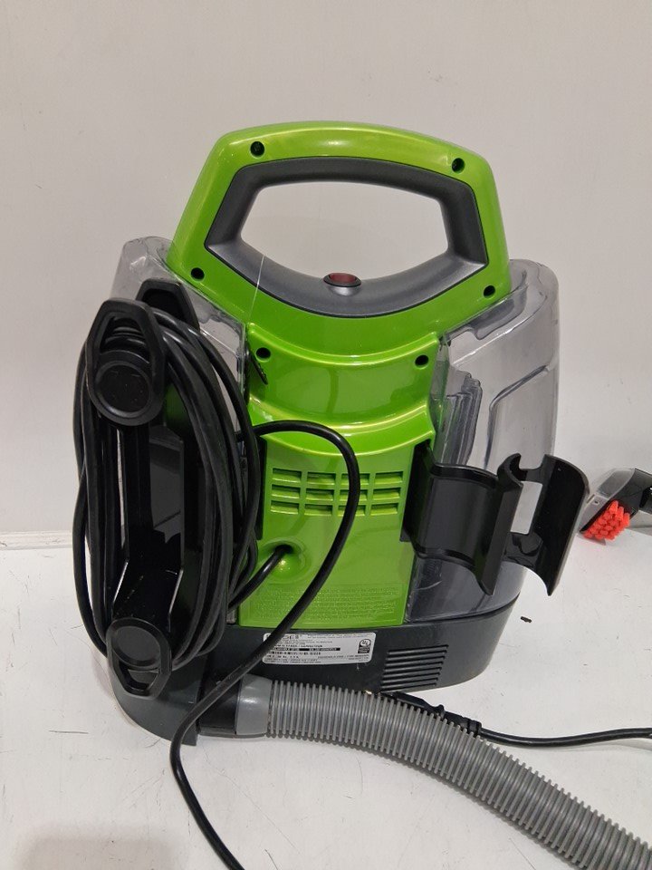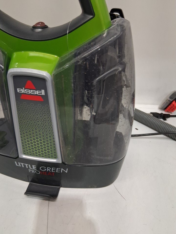 Item tested for power. There is a cut on the hose which may need to be replaced for proper functioning. There is some water/dirt residue from previous use. Missing the cleaning solution.