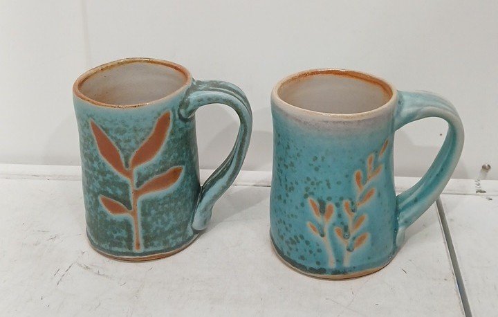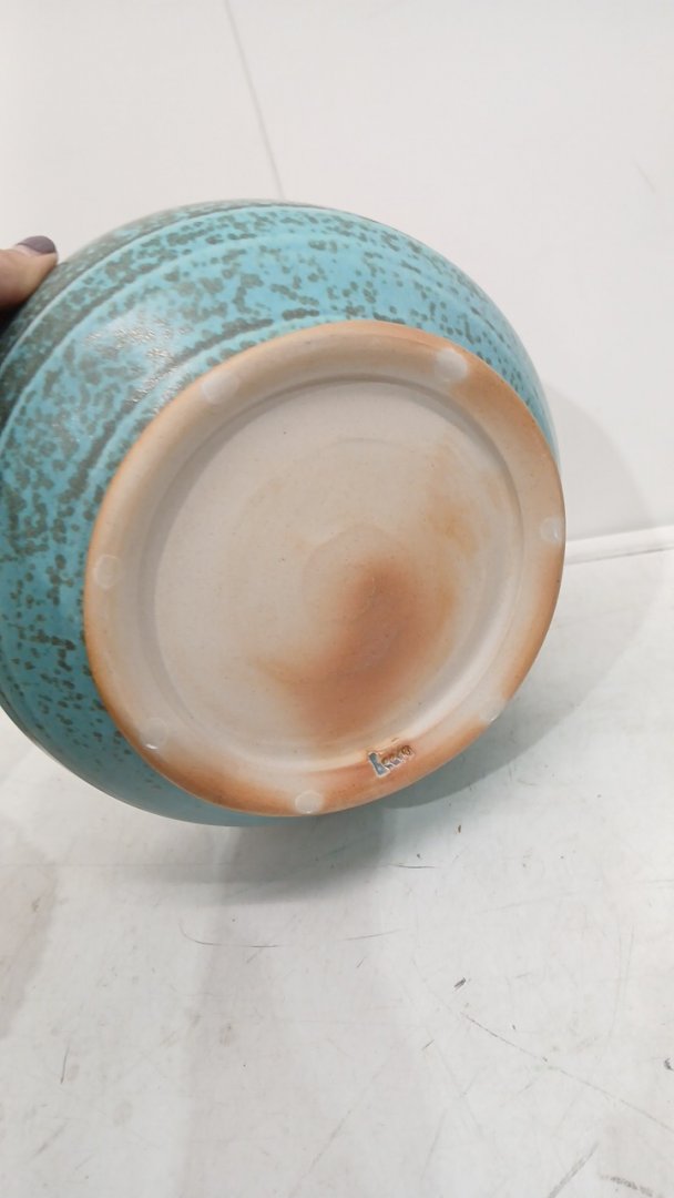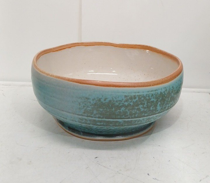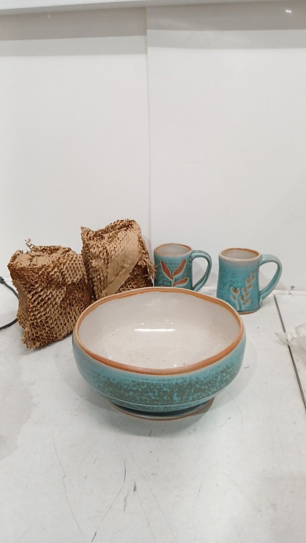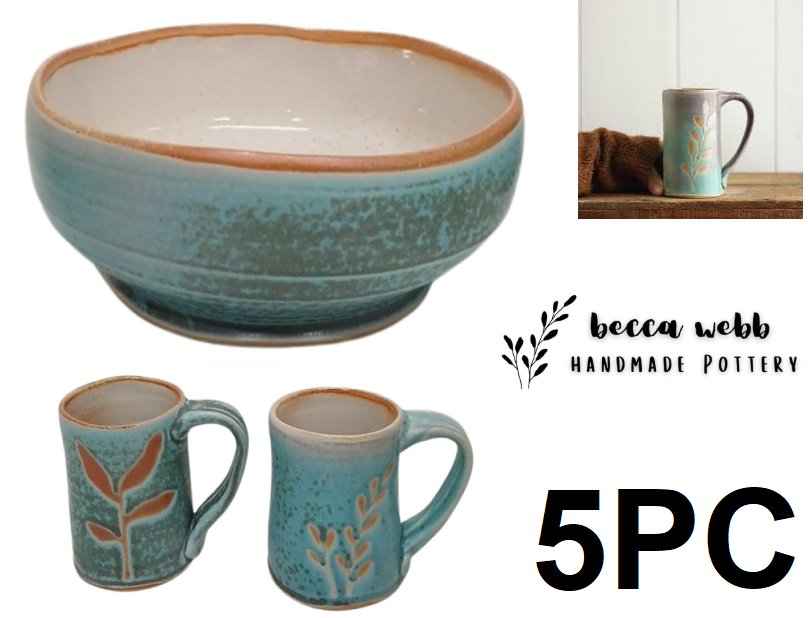 5pc becca webb handmade stoneware clay pottery set - 4 mugs and one serving bowl - assorted styles -teal/natural