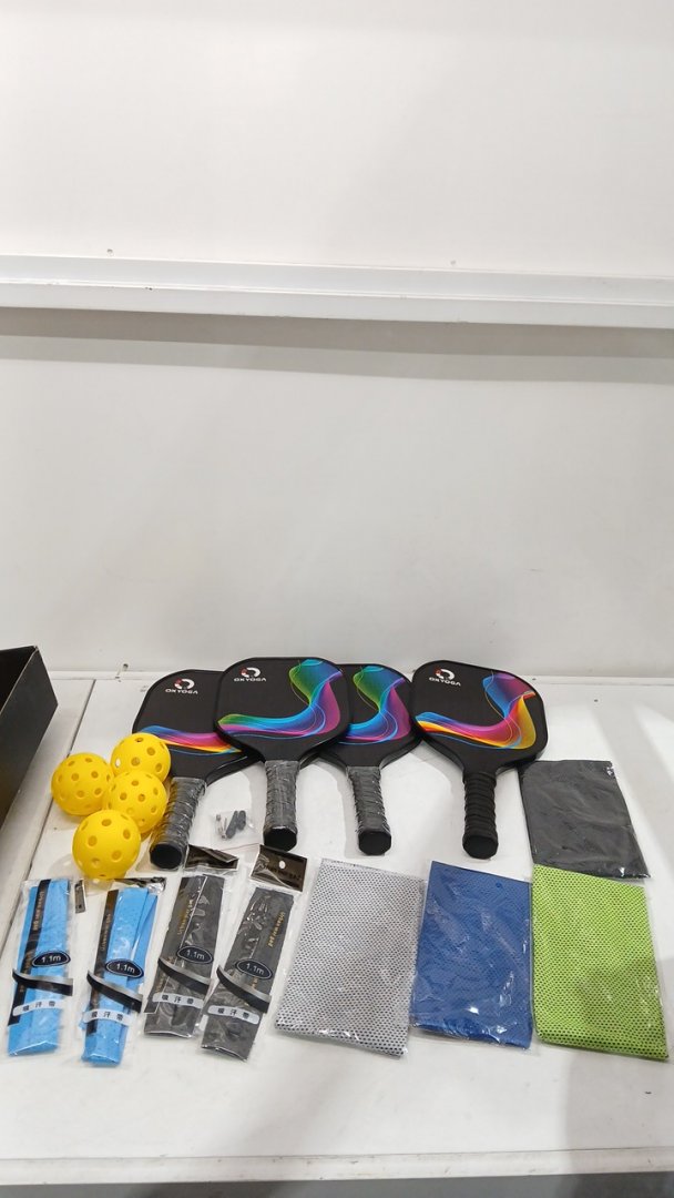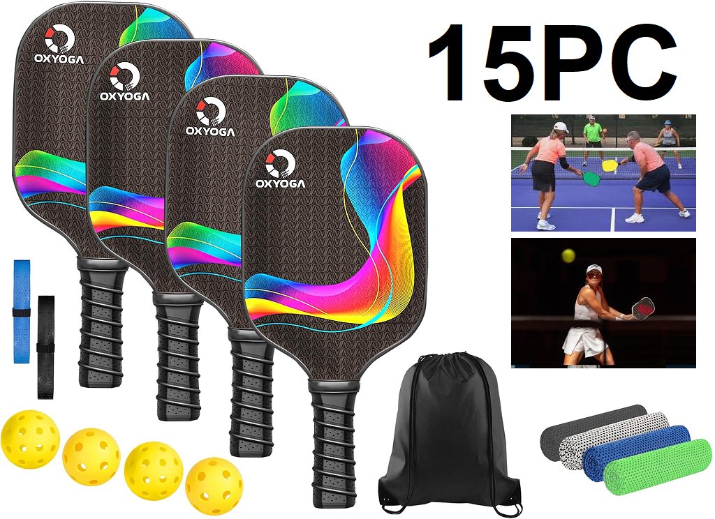 15pc oxyoga pickleball paddle set for 4 players with comfort grip handles - multicolored (model: oy-blk-w01)