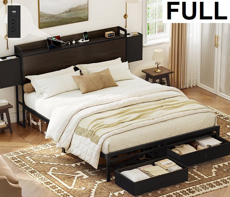 LINKALL modern heavy duty bed frame with storage drawers and charging station - full - black (model: hb0152)