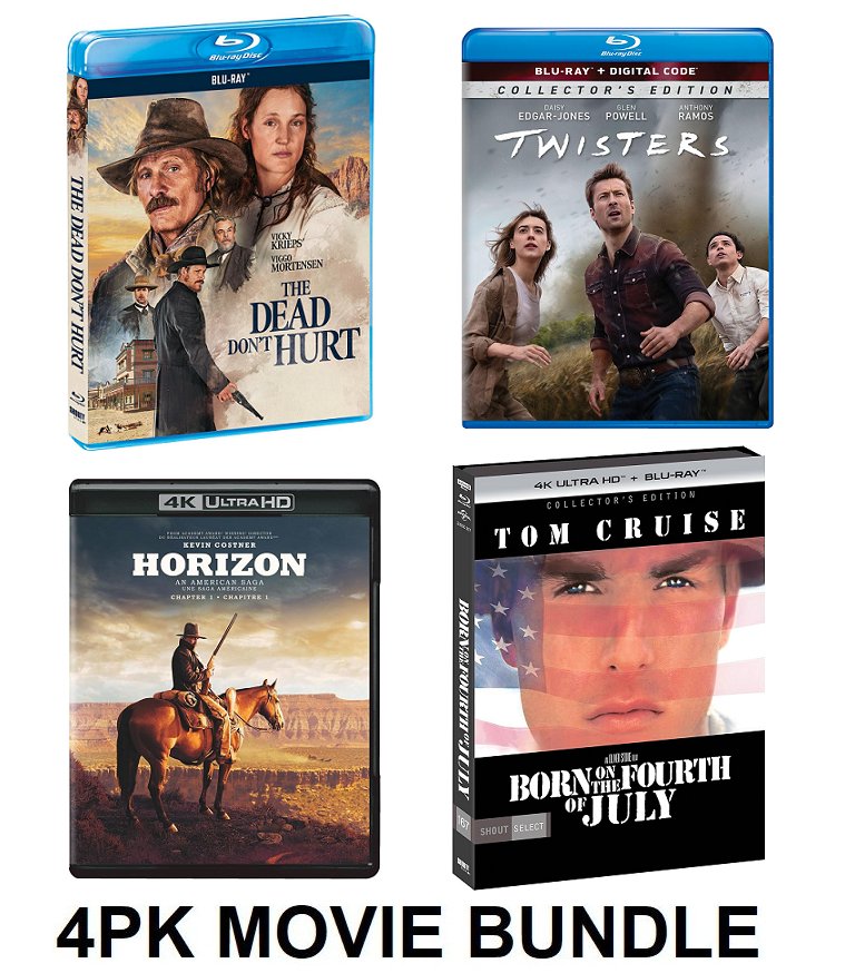 4pk BLU-RAY & 4K UHD americana/action/suspense MOVIE BUNDLE: the dead dont hurt, twisters, horizon an american saga chapter 1, & born on the fourth of july