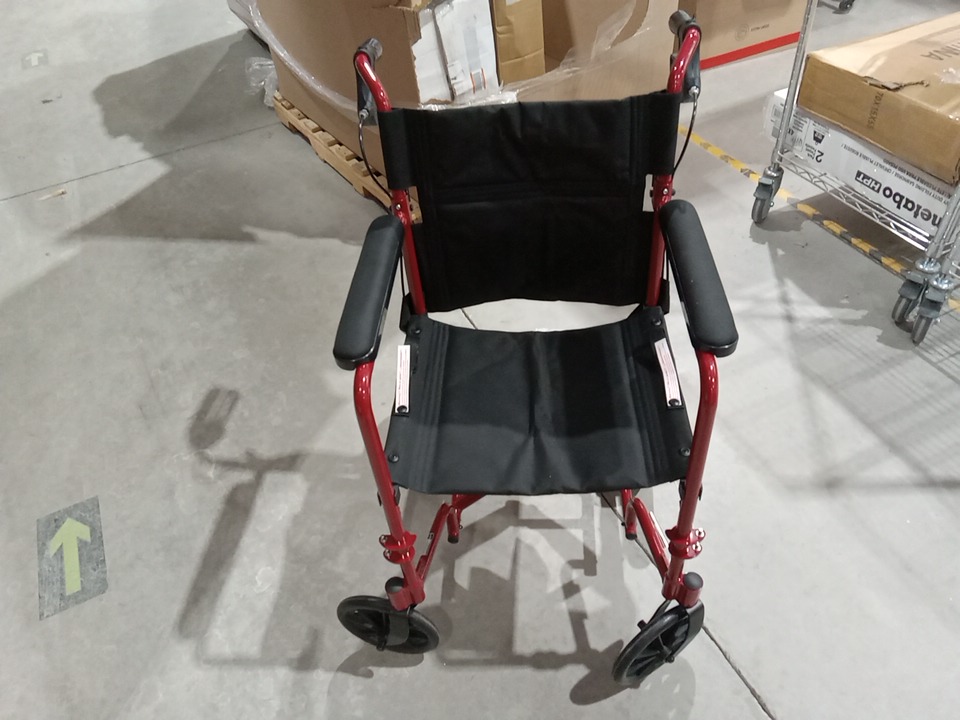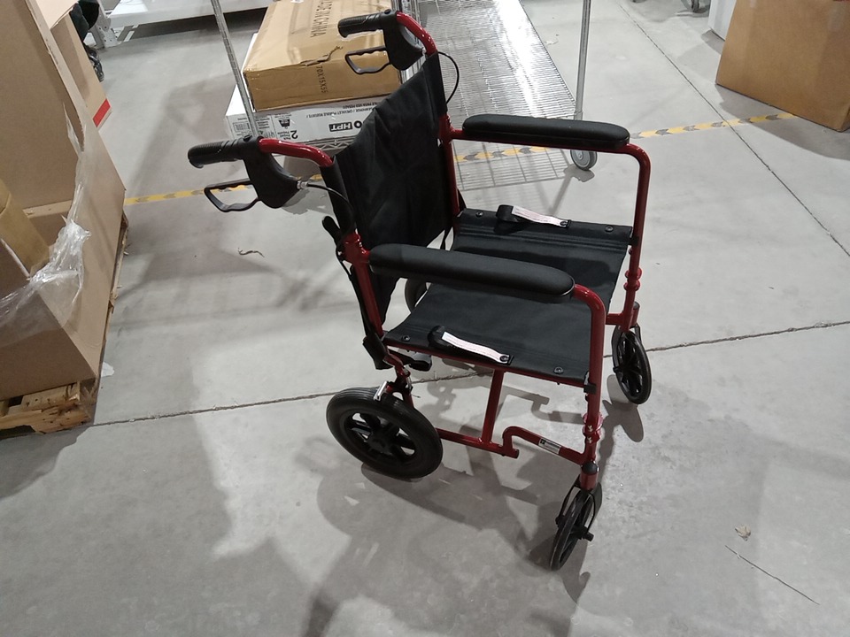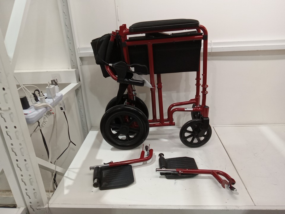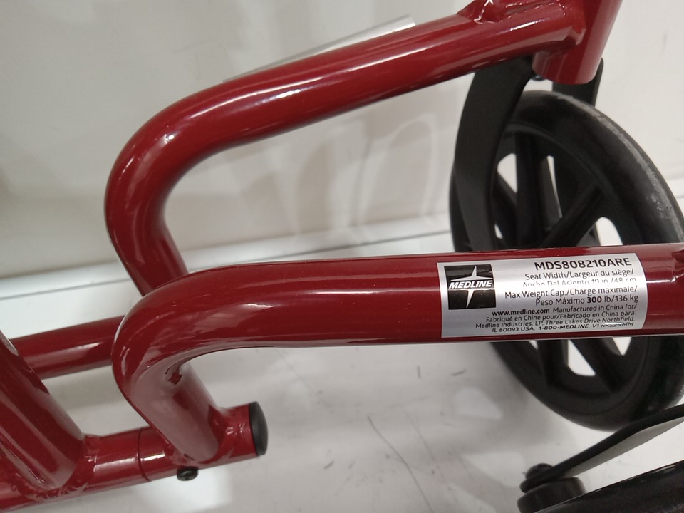 MEDLINE BASIC ALUMINUM TRANSPORT WHEELCHAIR - 19" - 12" REAR WHEELS WITH BRAKES - 300lbs capacity - RED (MODEL: MDS808210ARE)