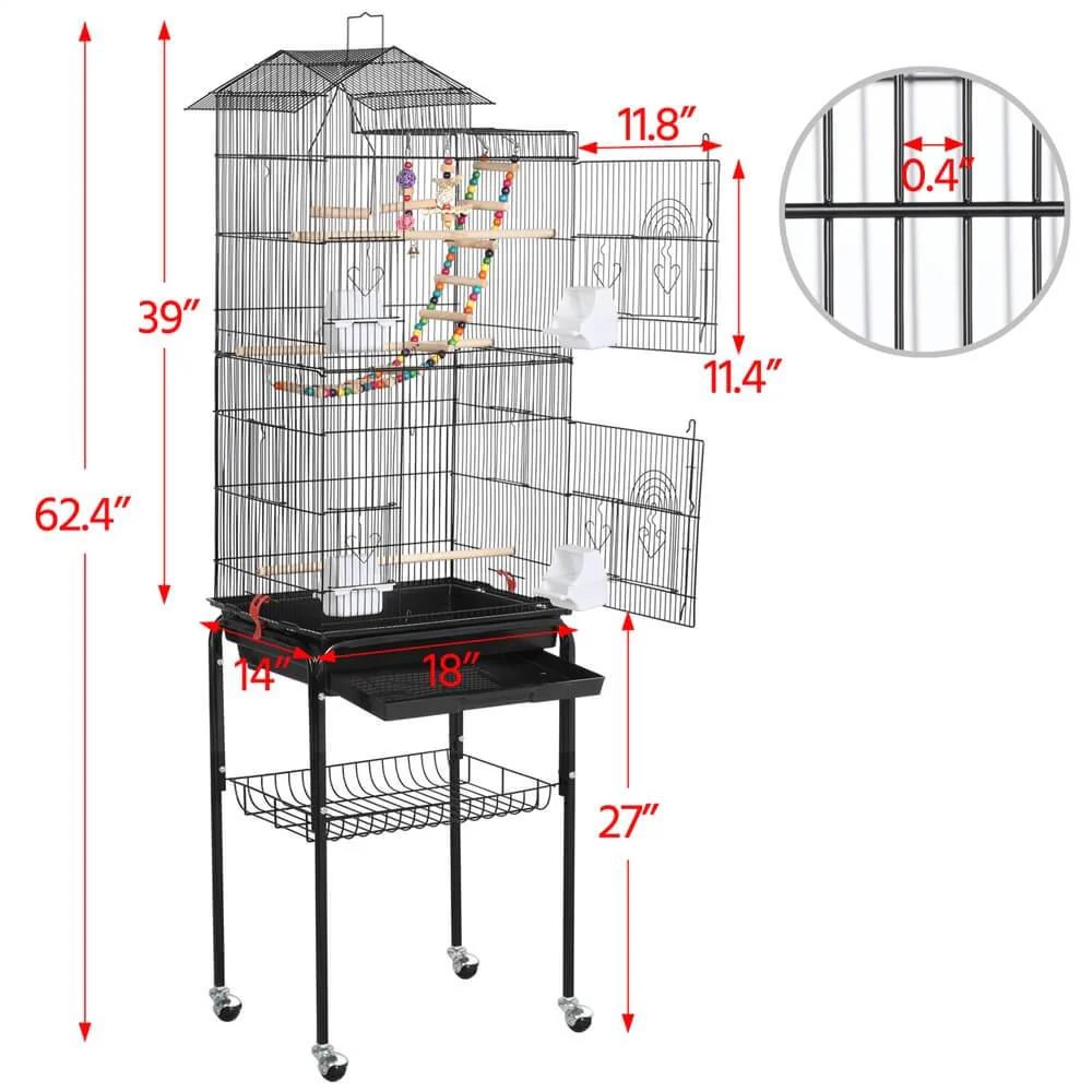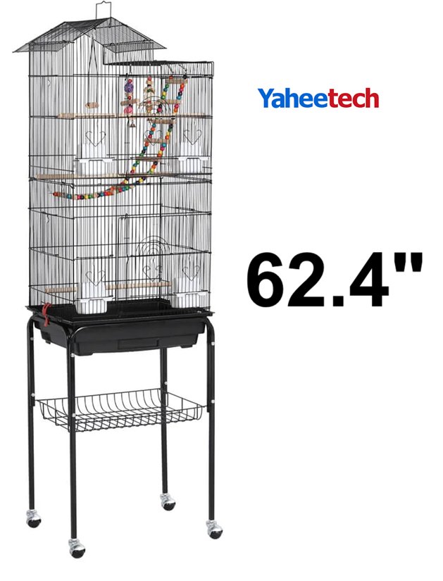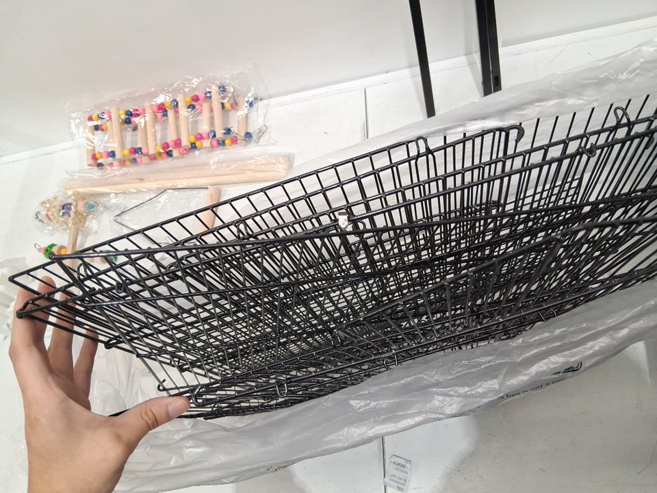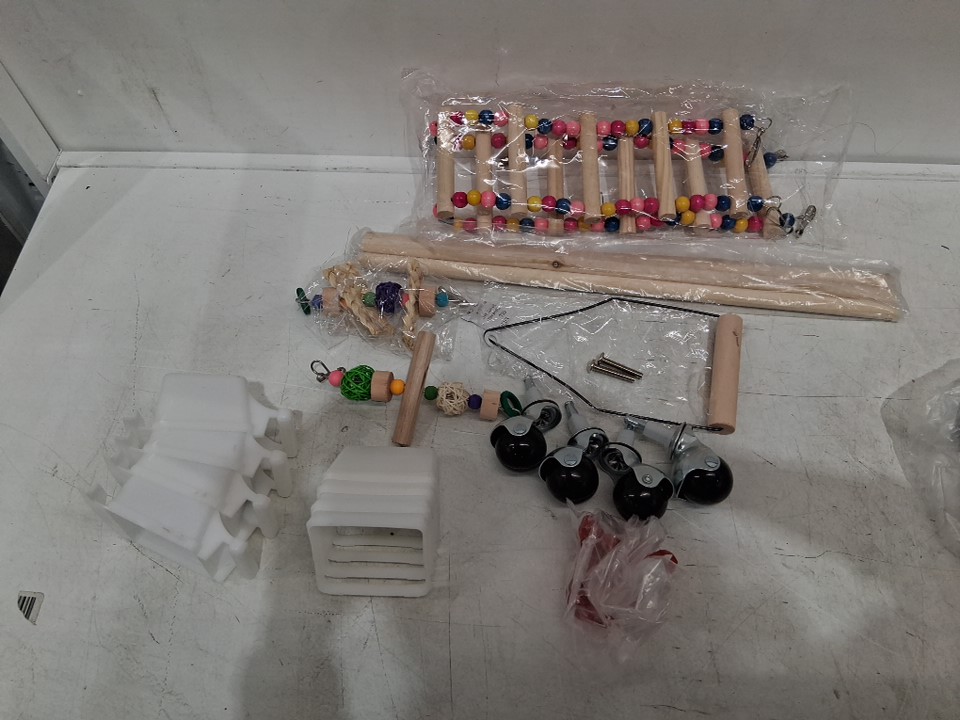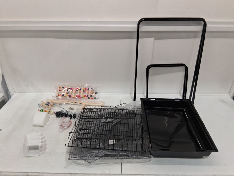 item missing manual but all parts appear to be present. All included accessories present: 4 x plastic feeders; 3 x wooden perches; 2 x toys; 1 x ladder; 1 x swing Signs of use in the bottom tray area and wheels see photos
