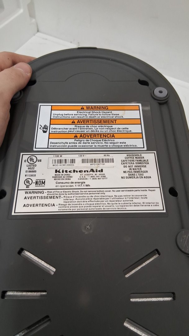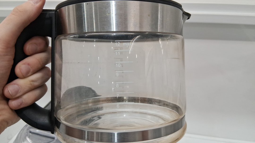 there's some residue in the pot and water spots in the reservoir , and the whole thing smells like coffee, tested for power