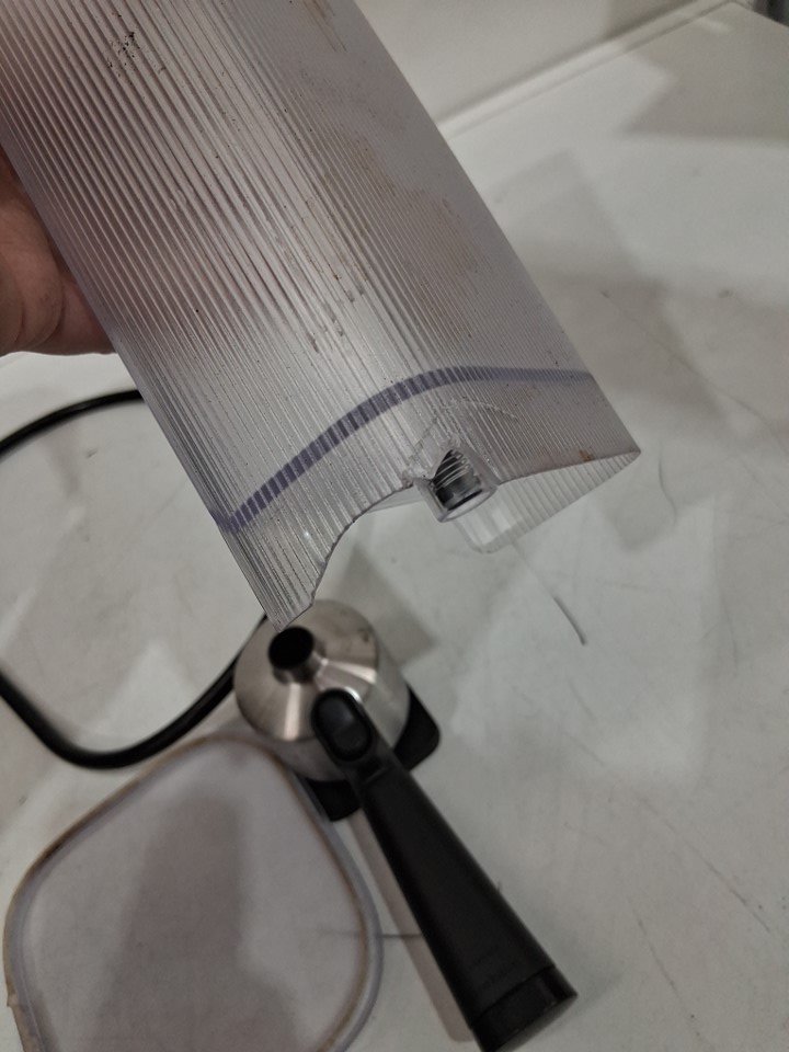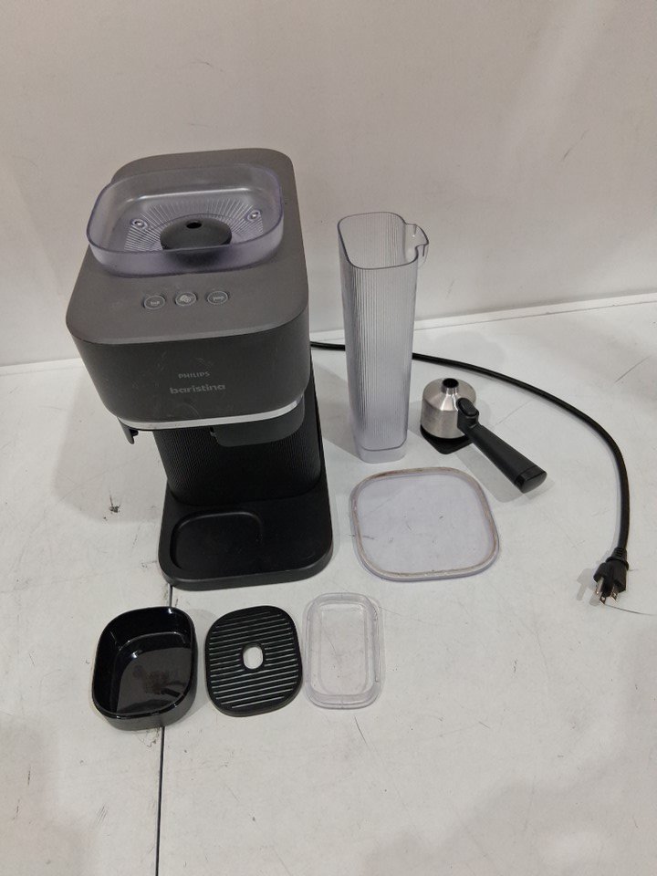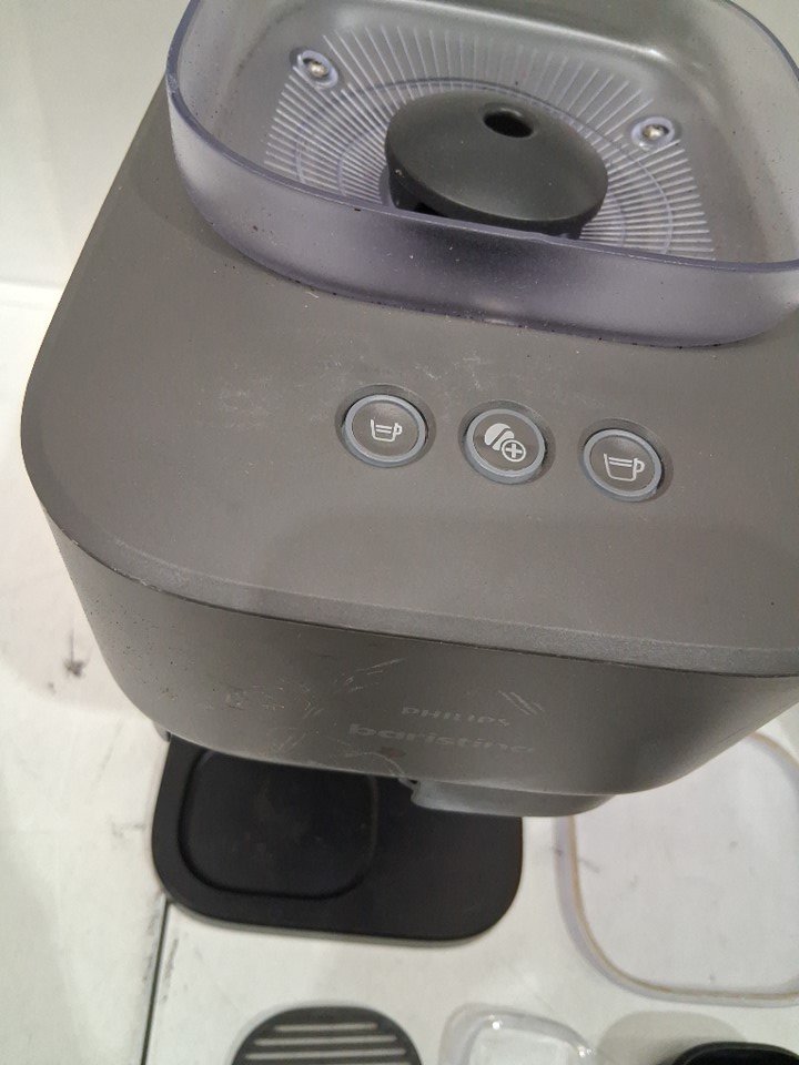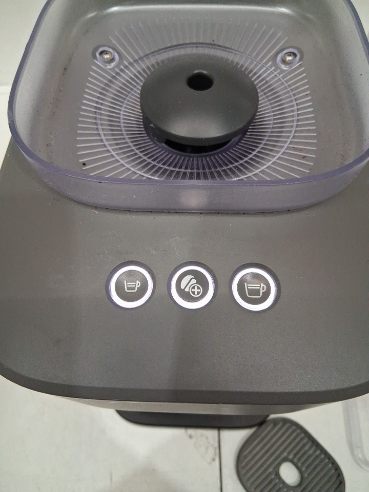 Item shows signs of previous use such as coffee debris inside/outside unit, and scuffs/scratches on top of unit. Items water container has a cracked/broken base, does not impede function. Item tested for power.
