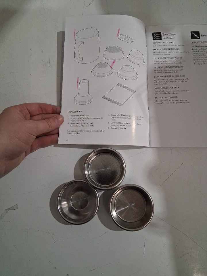 Product is missing one of the 4 filters and has grinds and coffee residue throughout (see photos)