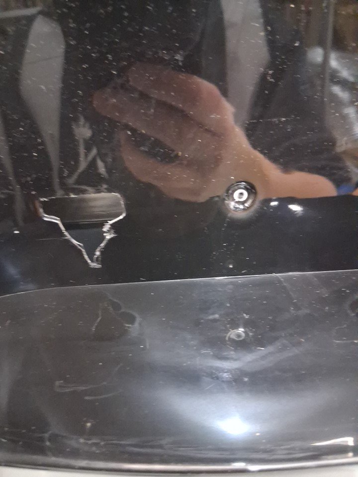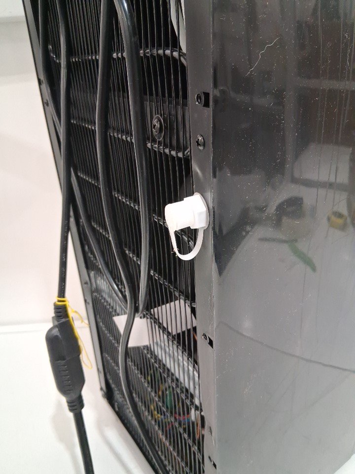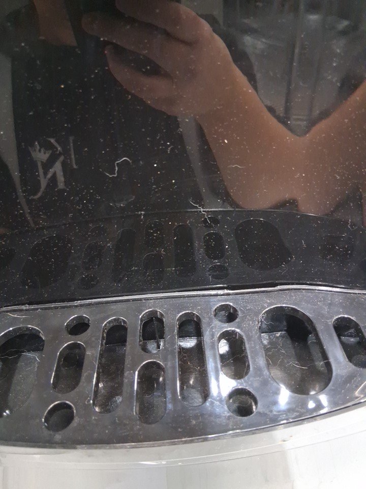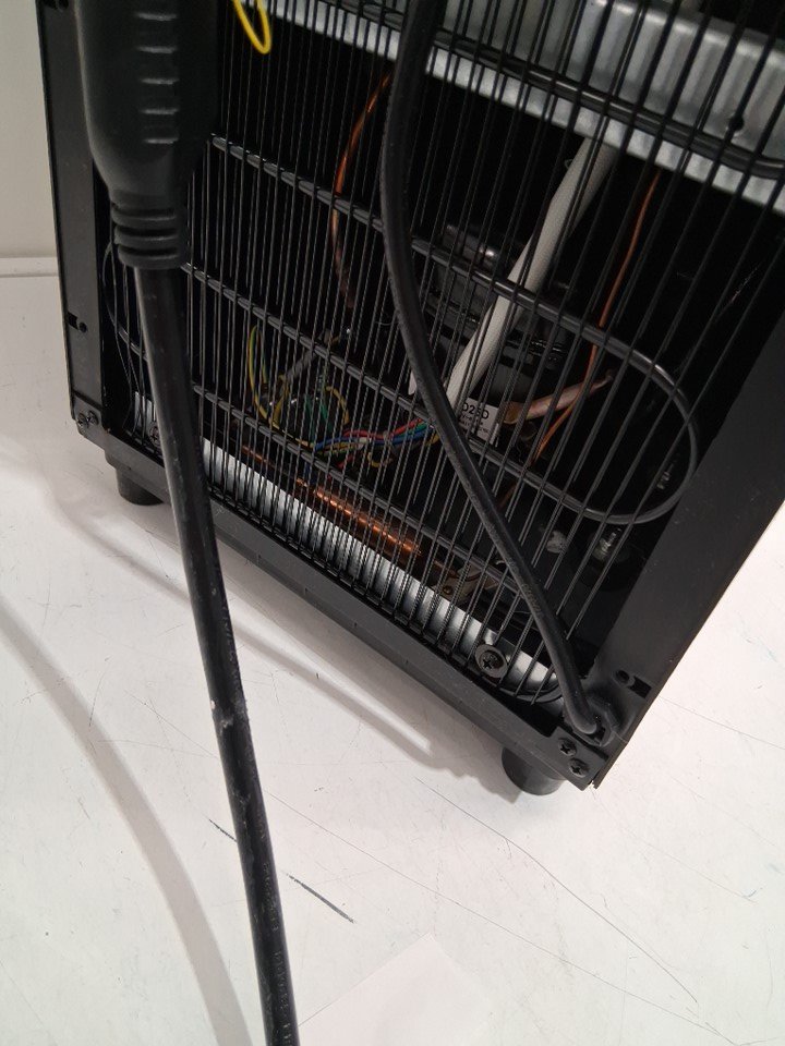 there is a piece of plastic broken behind the catch tray but this does not affect the tray staying in place. there is also a small dent on back. neither issue affects function. tested for power.