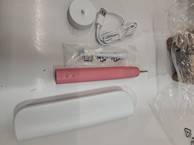 There is a bit of toothpaste residue on the brush handle and one of the included brush heads came opened. tested for power