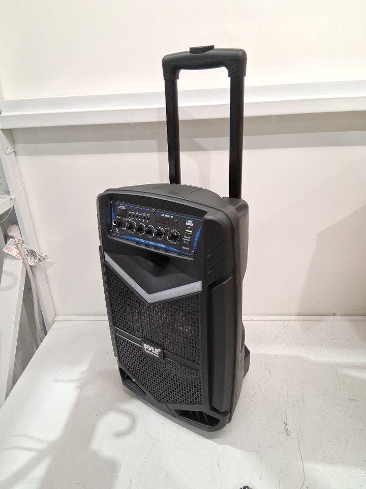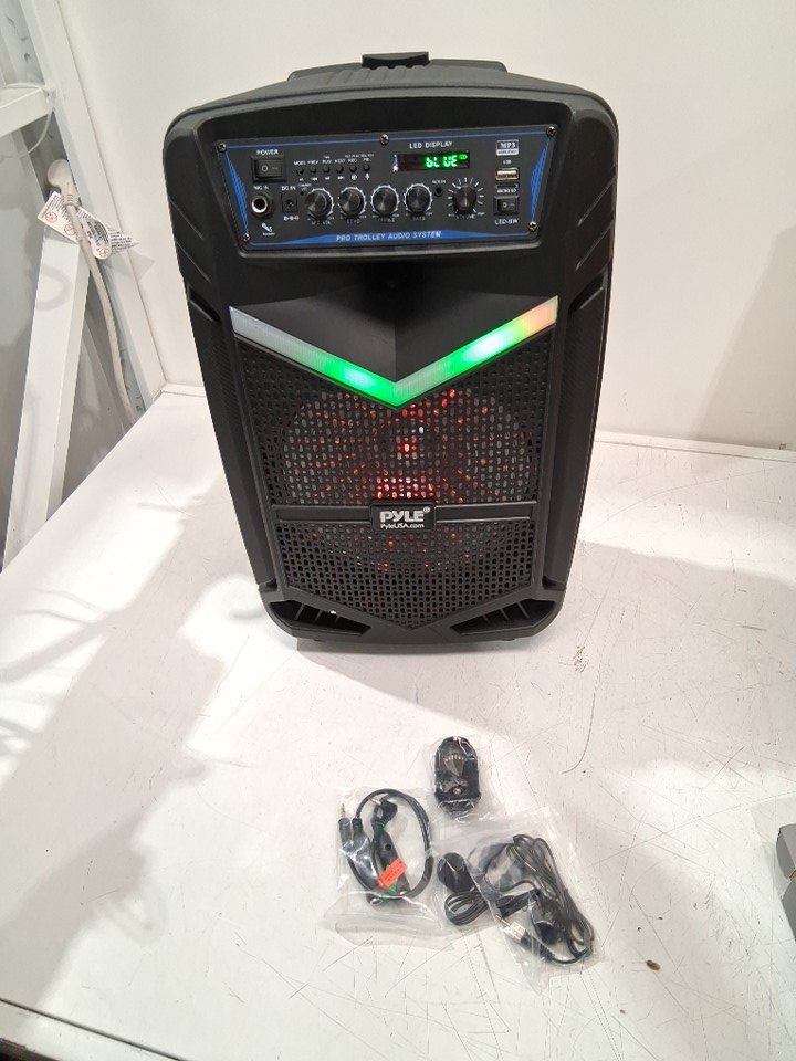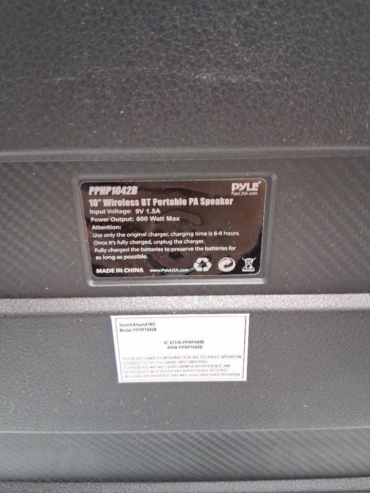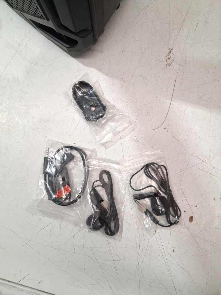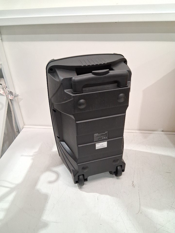 item has dirt, dust and scuffs on it from previous use and is missing the large microphone and remote - tested for power, bluetooth connectivity and function. see photos