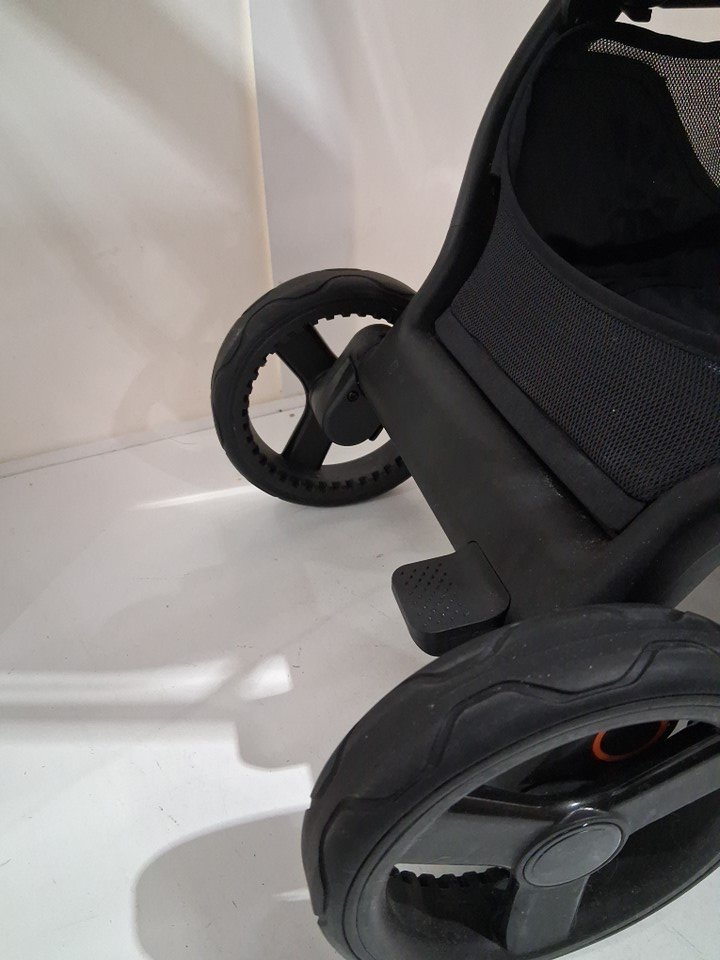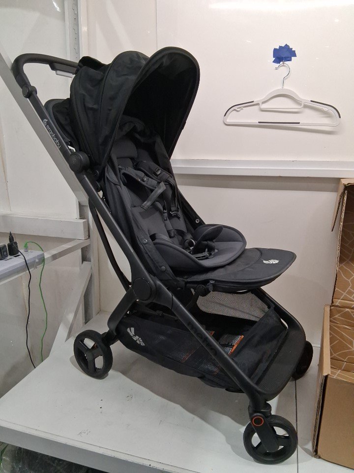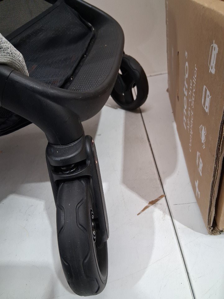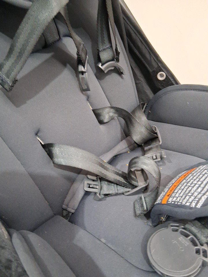 Signs of crumbs and debris, scuffs on side pieces, still in good condition (wheels don't have much wear overall fabric doesn't see much or any distressing.