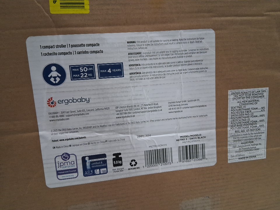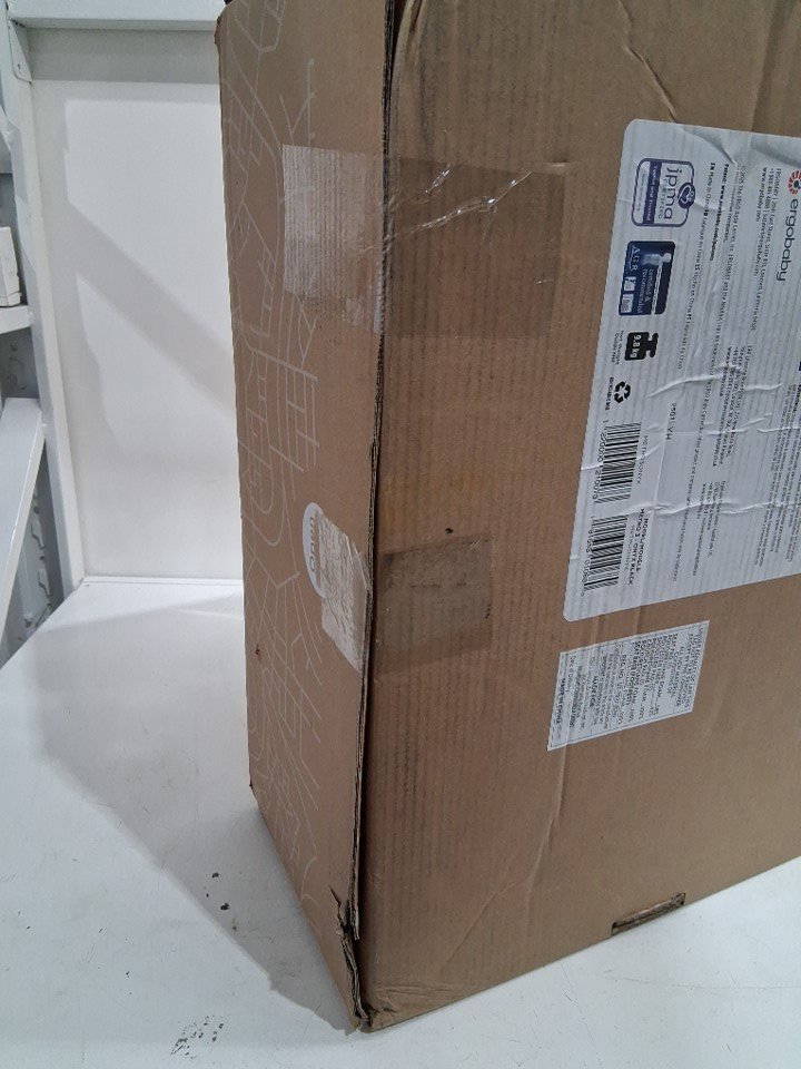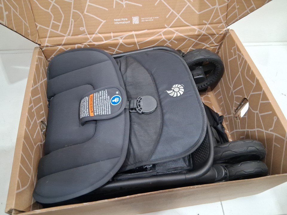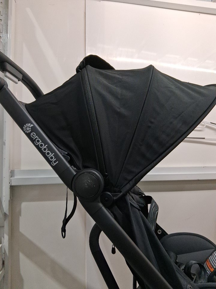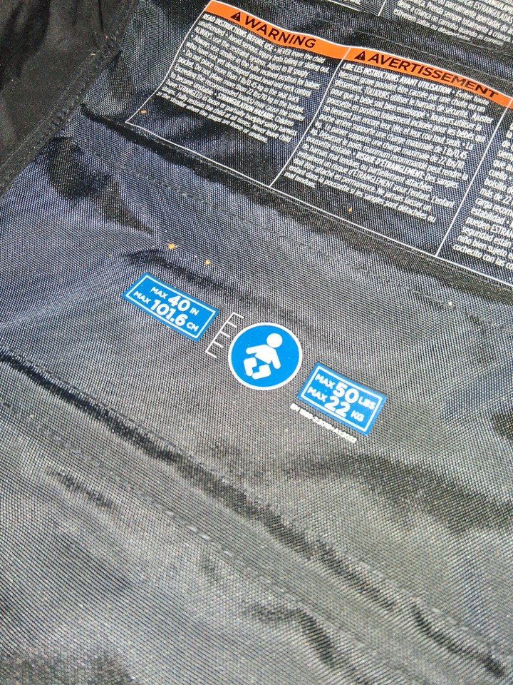 Signs of crumbs and debris, scuffs on side pieces, still in good condition (wheels don't have much wear overall fabric doesn't see much or any distressing.