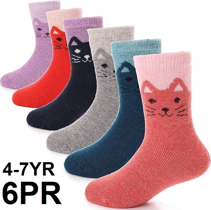 6pr unisex kids antsang merino wool thermal cat socks - ages 4 to 7 yr - multicolored
