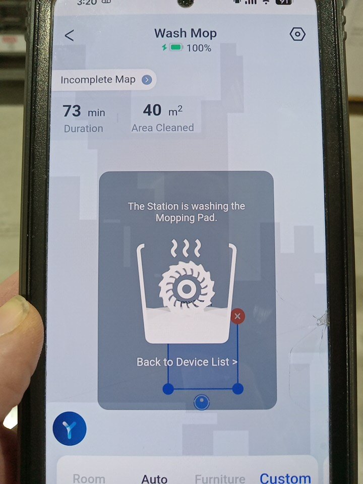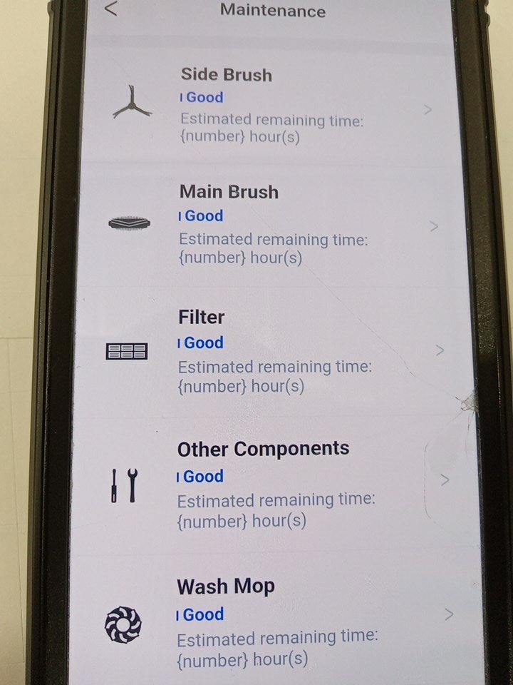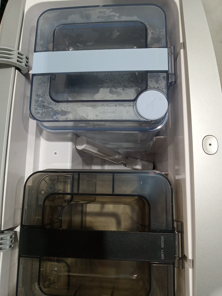**Tested for power, app connectivity, basic functions (mapping/return home).** Item has some dust/debris build-up in the docking area and dustbin/filter area, residue markings in the reservoirs, some wear on the main roller and side brushes from previous use and some surface scratches/scuffs on the station. Item seems to have a slight issue with moping as next to no water came out from the station which in return made the vacuum not effective at moping (there could be a slight blockage and could just use a thorough cleaning of the item to help with it effectively working). See attached photos.