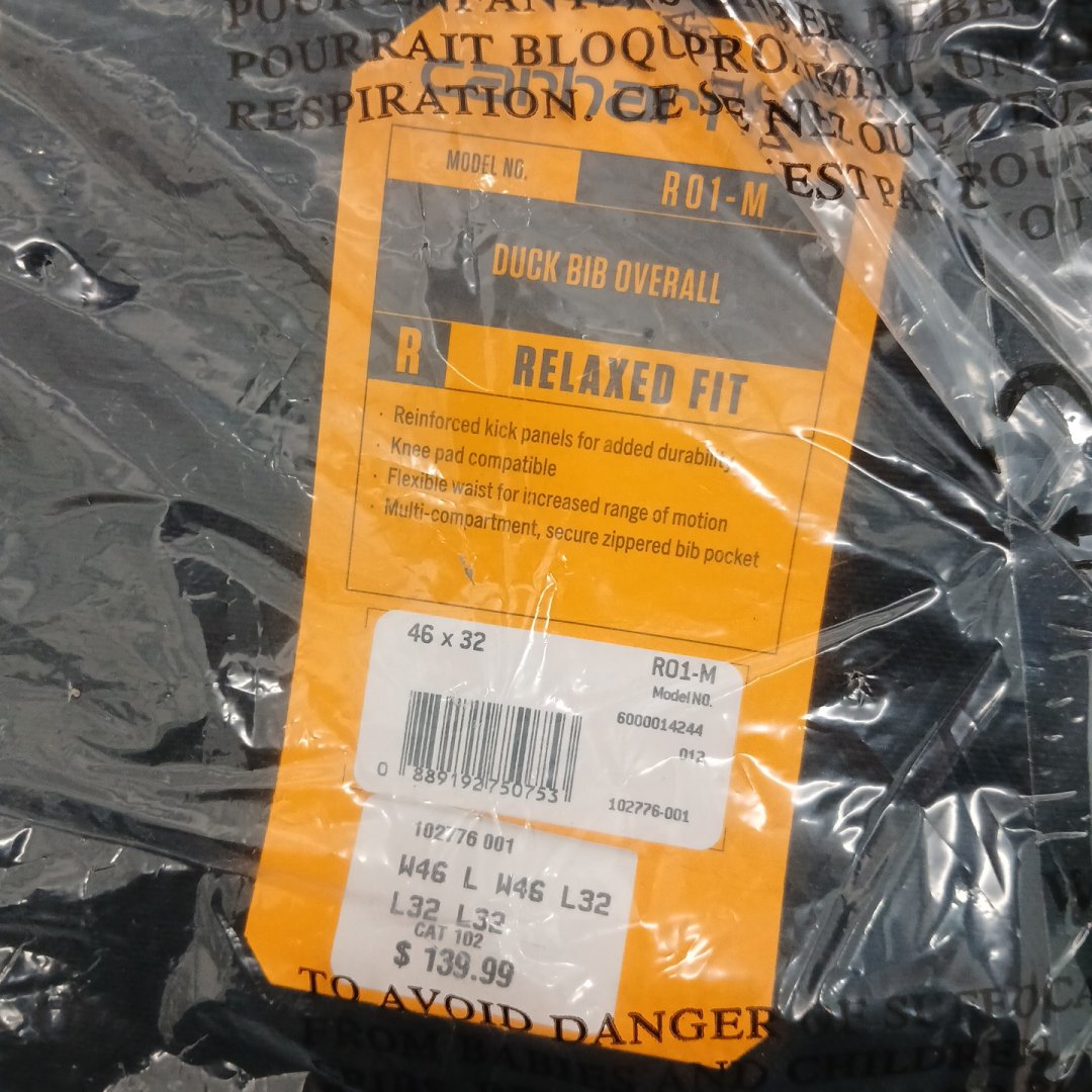 MENS CARHARTT RELAXED FIT DUCK BIB OVERALLS - 46W X 32L - BLACK (STYLE: R01-M)