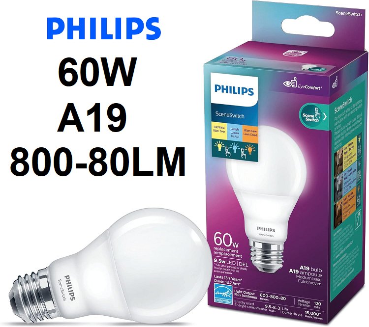 Philips light bulb with 3 light settings - 60W 800-80LM A19 bulb