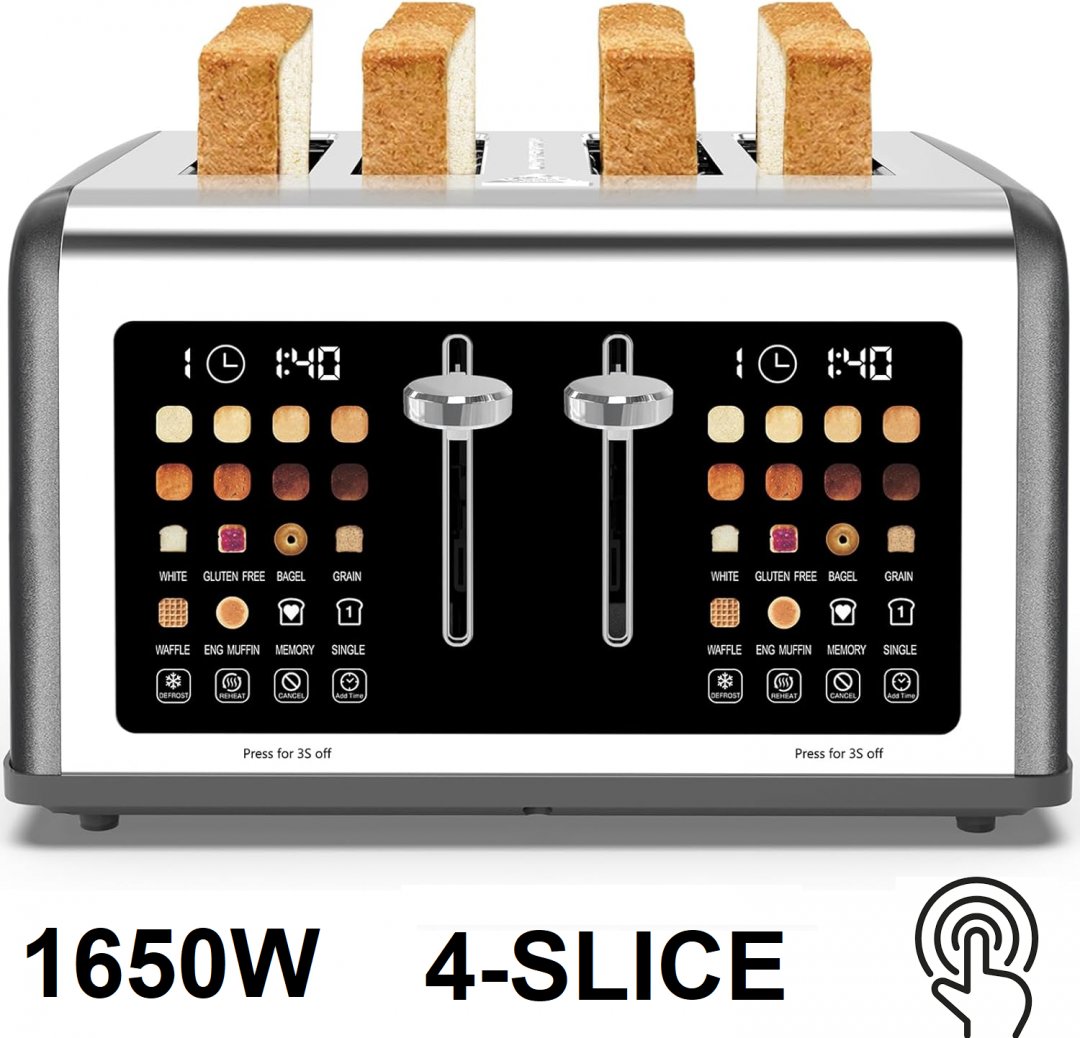 CLIXANE 4-SLICE TOUCH SCREEN TOASTER - DUAL CONTROL PANEL, DIGITAL TIMER AND 8 SHADE SETTING TOASTER - 1650W - STAINLESS STEEL (MODEL: WT-8206E)
