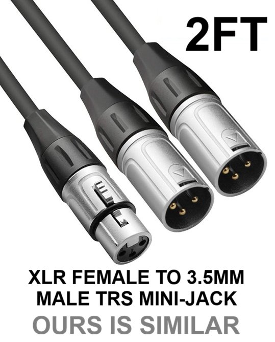 jomley XLR Splitter y-Cable - 2ft, 2 XLR Female to 3.5mm male TRS mini-jack connector - black/grey