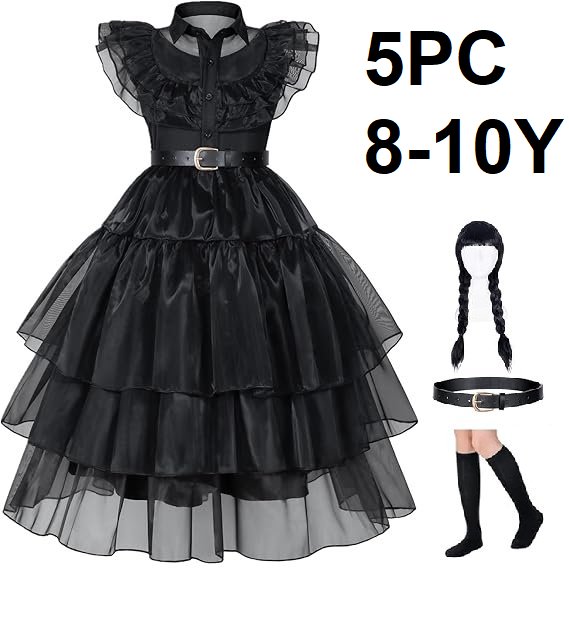 5pc girl's "wednesday adams" costume - 8-10 years - black