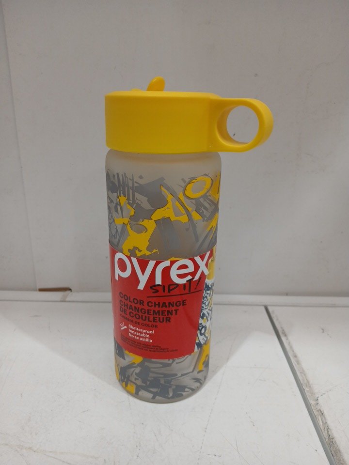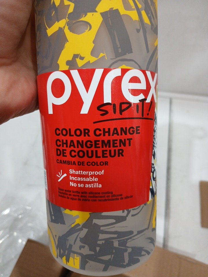 pyrex sip it! colour changing shatter-proof glass water bottle - 24oz - yellow & grey/blue