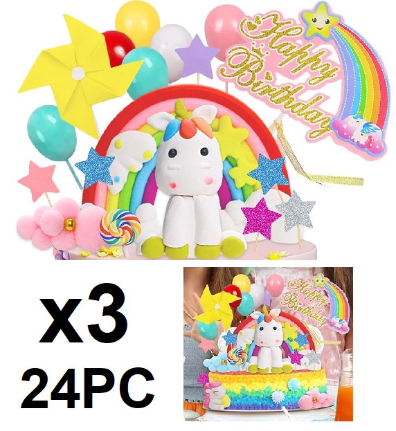 3 (24PC) unicorn Rainbow Cake Topper - assorted size - multicolor