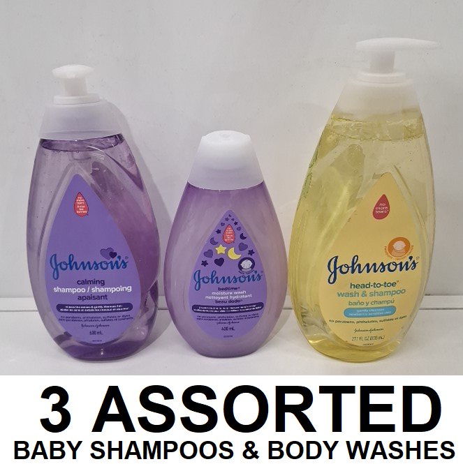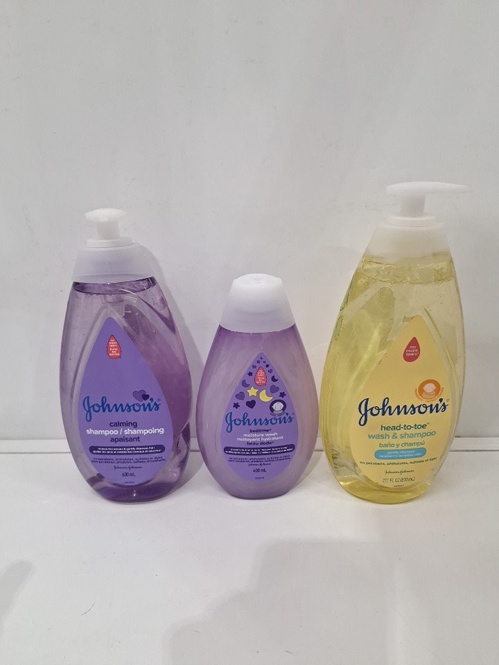 3 ASSORTED BABY SHAMPOOS & BODY WASHES - JOHNSON'S HEAD TO TOE WASH & SHAMPOO, CALMING SHAMPOO & BEDTIME MOISTURE WASH
