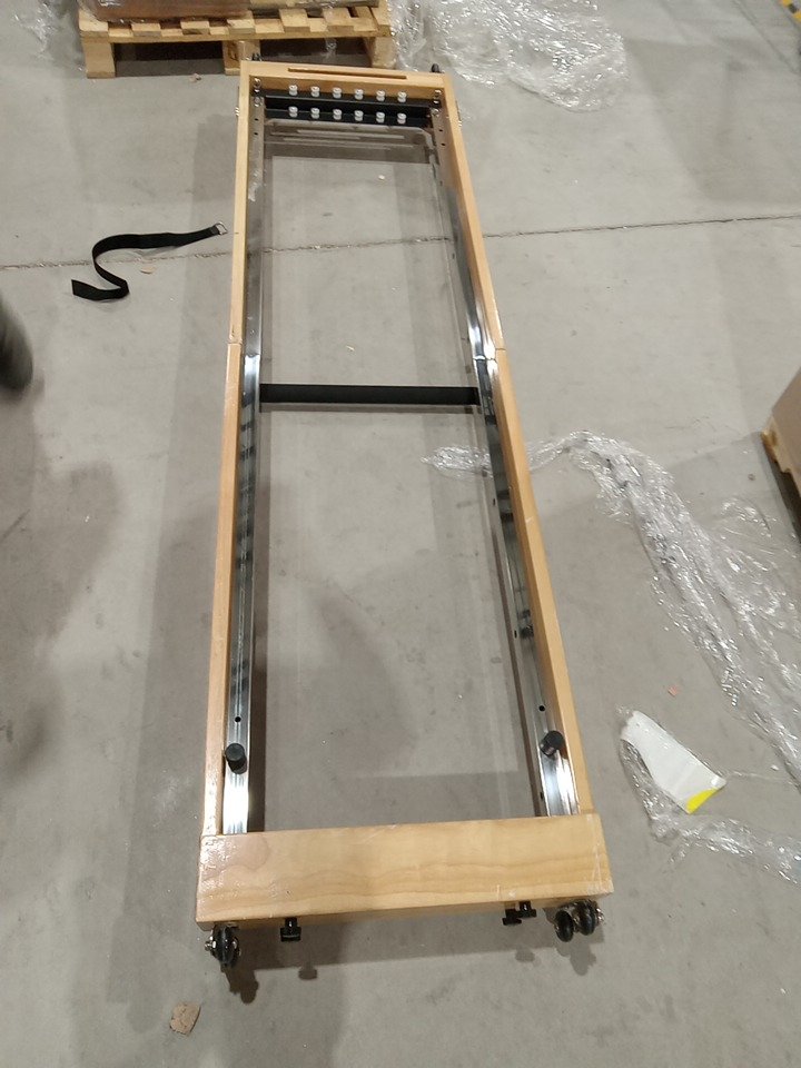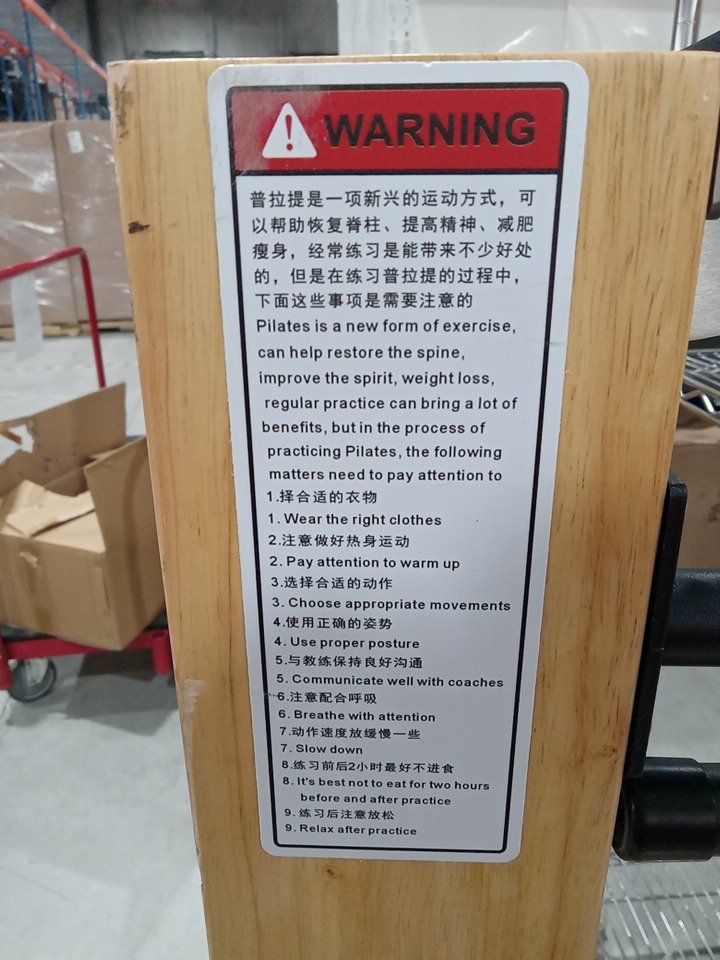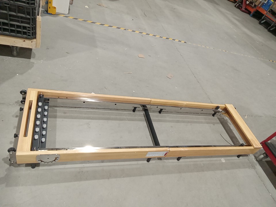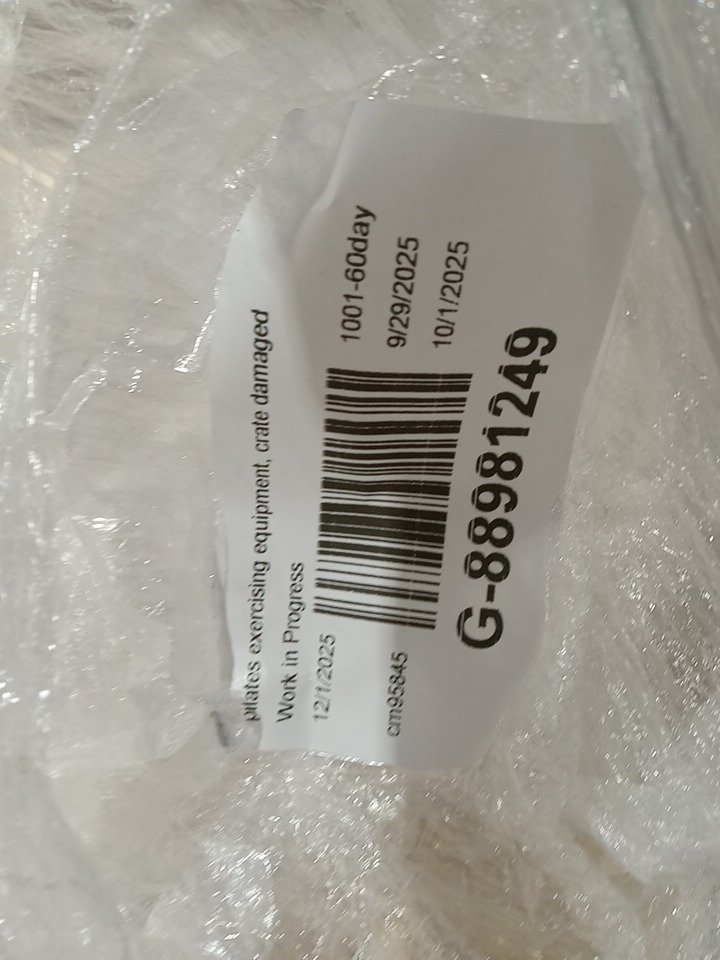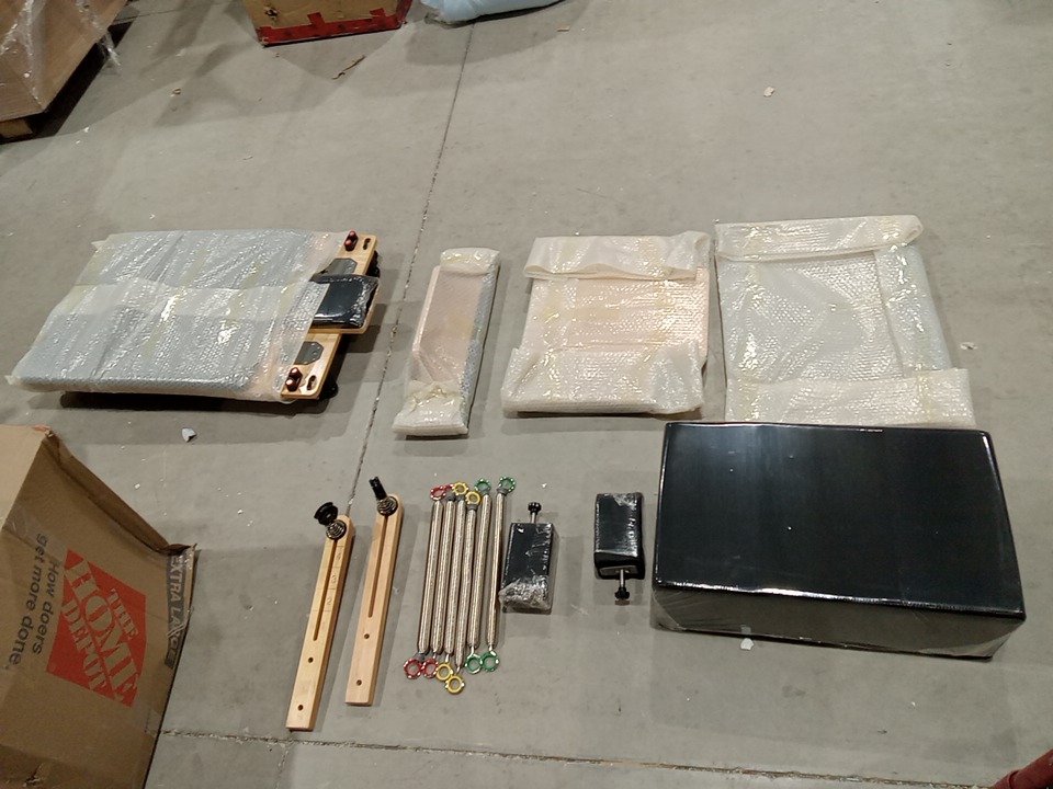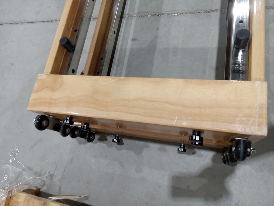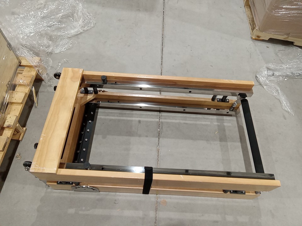 Upon inspection we have found no brand/ model name or information on this item meaning we had to make this listing based off examples found online, keep in mind that the Pilates machine seen in the main photo is meant to be used as an example, but it is very similar to the Pilates machine in this listing and it may be the exact same one however we have no way of confirming that, we had to take our own measurements due to having no information and found that the dimensions are roughly 90" x 24.5". through inspection we have found that it seems to cables / rope accessories are missing as well as the black handles as seen in the main image, these pieces should be able to be acquired separately but we advise the customer makes sure that if they purchase the cable / rope parts that they make sure it is compatible with this Pilates machine . the wooden base piece has some scuffs / scratches / blemishes on it and their is some dust on the wheels from shipping and handling but the other pieces are in brand new condition. we are unable to confirm any weight capacity for this Pilates machine due to not having any model information. with the parts that are present in this listing, you should be able to use this Pilates machine without issue if the previously stated cable / rope accessories are acquired separately. this item also seems to be missing the support piece that is seen holding up the foot board in the main photo. see photos below.