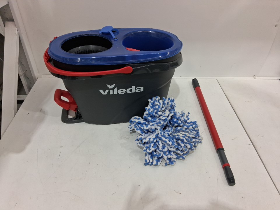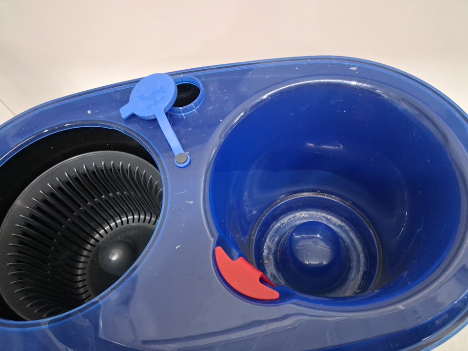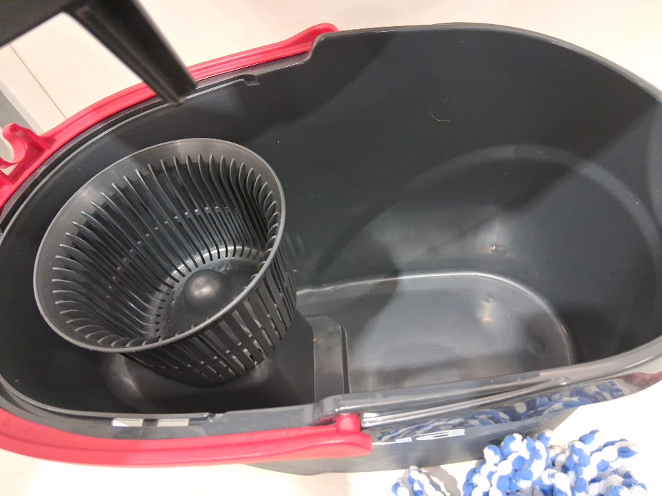 there is some dirt and debris inside the mop bucket as well as some water residue.