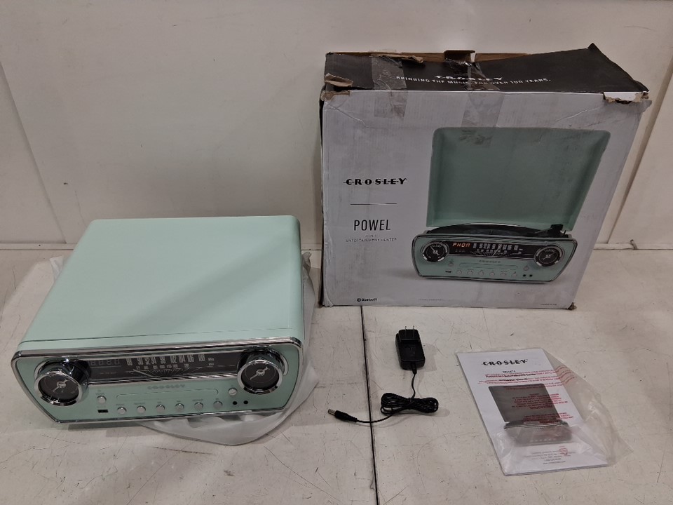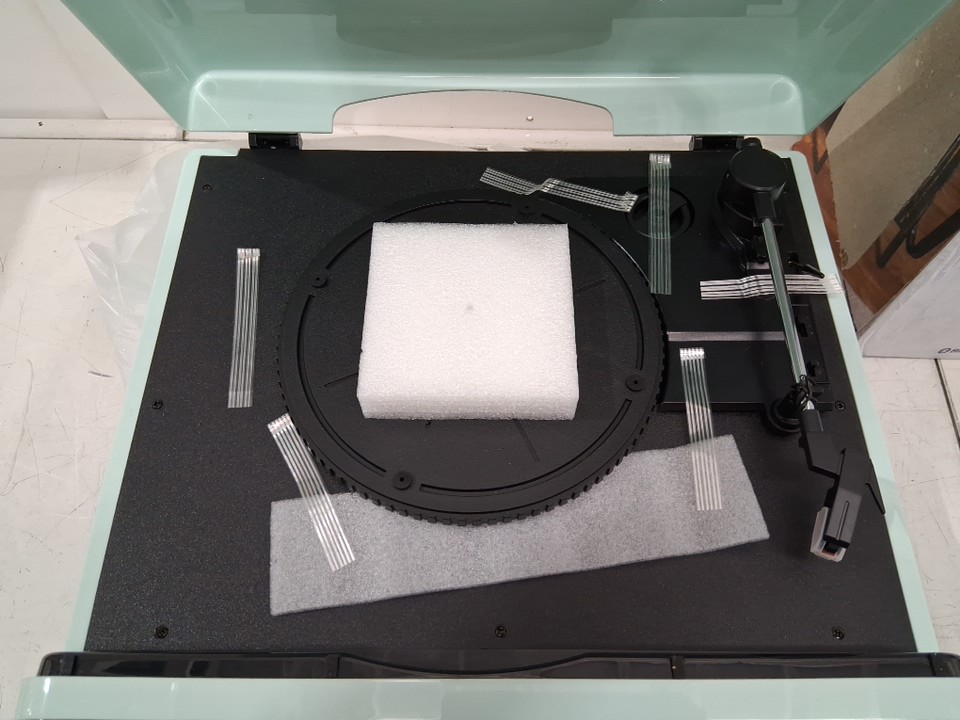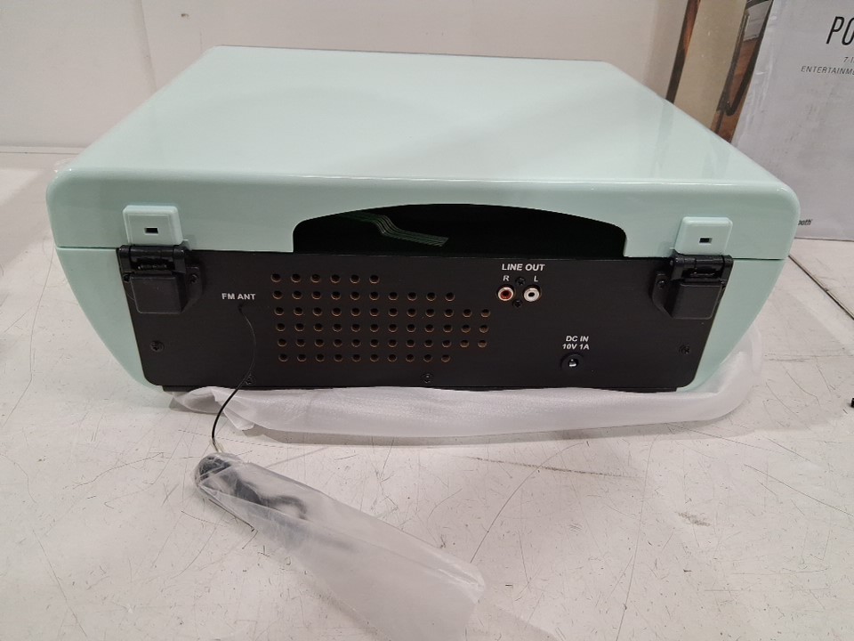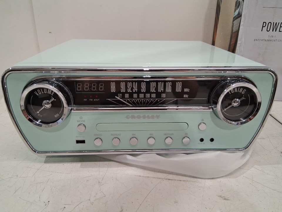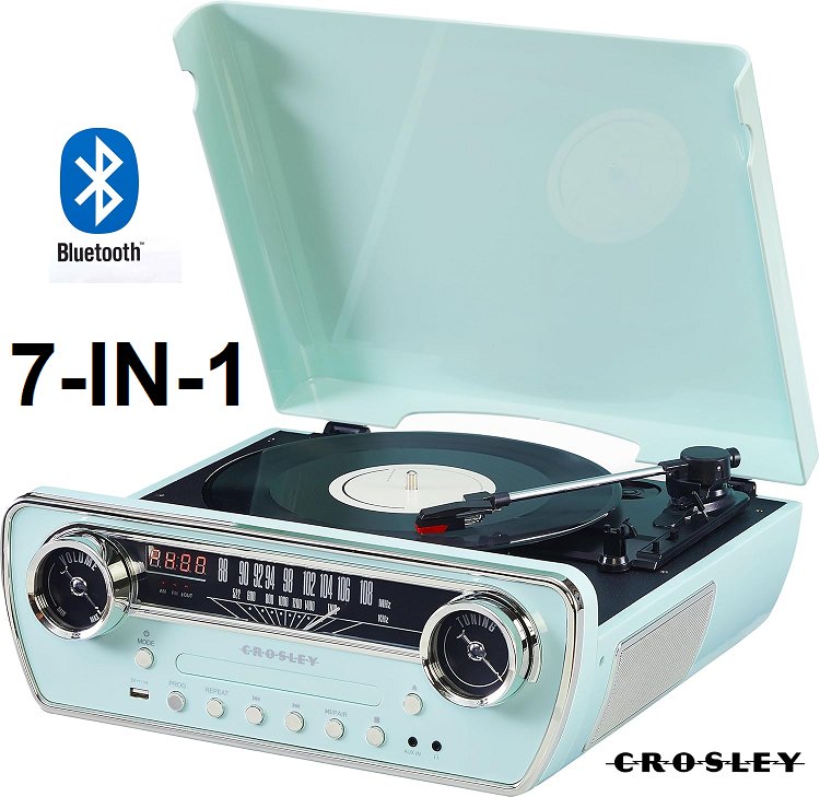 Tested for power 7-In-1 MUSIC PLAYER WITH AUTO STOP: Includes a three-speed turntable with a 45 adapter, which plays 33 1/3, 45, and 78 RPM records. The record player includes an AM/FM radio and a CD player.