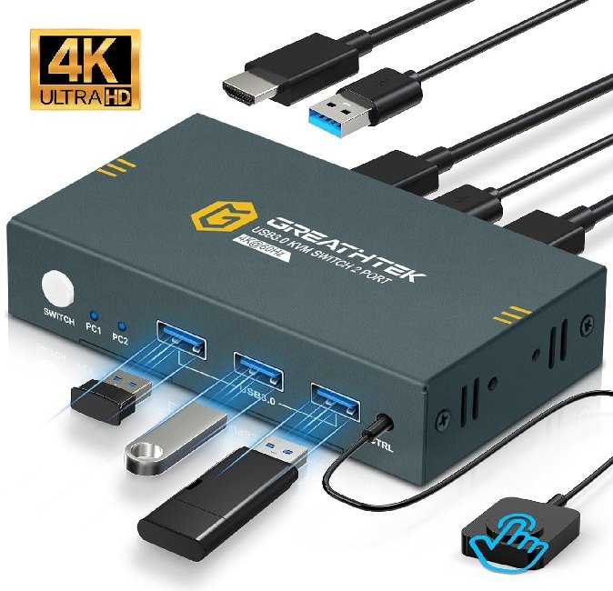 greathtrek 4K@60Hz HDMI KVM Switch with 3 USB 3.0 High-Speed Transmission, 2 hdmi ports - black