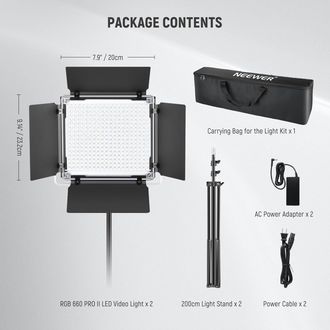 2pk neewer 660 pro ii rgb led lighting kit for video/photography with app control - 50W 3200~5600K, 3ft~6.5ft - (model: RGB660 PRO II)