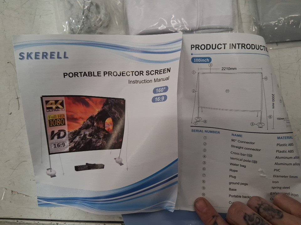 SKERELL PROJECTOR SCREEN WITH STAND & CARRY CASE FOR INDOOR/OUTDOOR THEATER, 16:9 4K HD REAR FRONT, FLOOR MOUNT - 100" - WHITE/GREY (MODEL:SKLI-100)