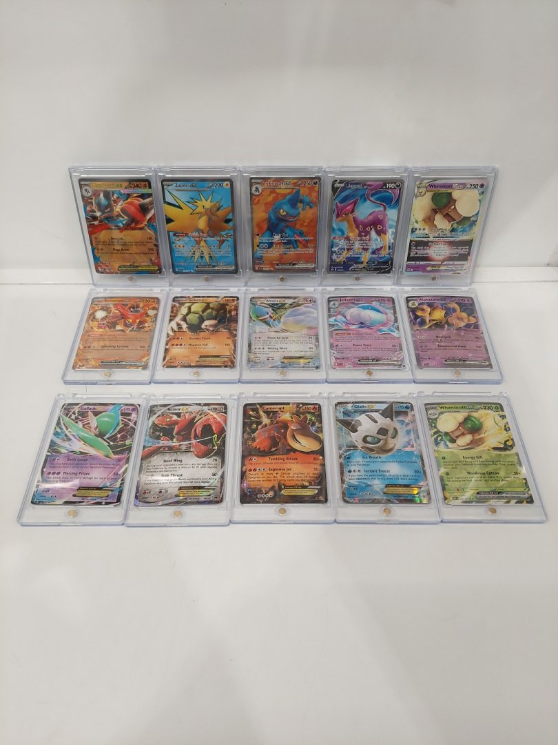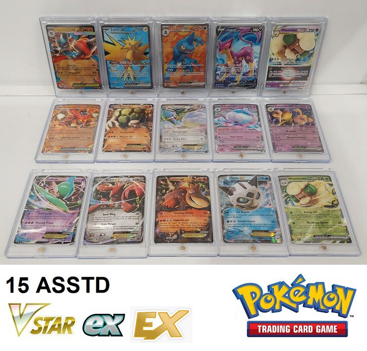 15 asstd Pokemon rare EX/VSTAR collector cards in hard collector protective cases