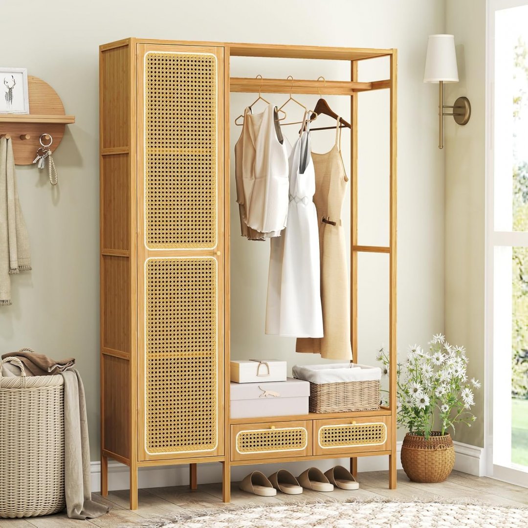 costway bamboo clothing rack with cabinet and drawers - 40" x 13" x 63" - natural - (model: jv12758na)