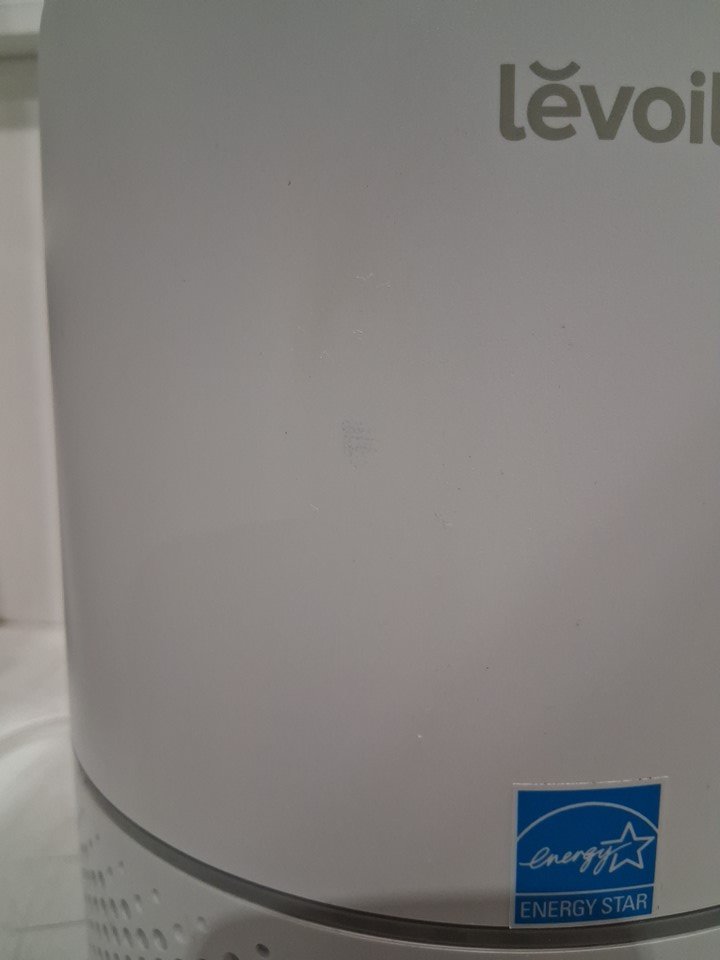 There is a scuff mark on the bottom of the purifier and a small faint scuff mark on the front of the purifier. There is also a light amount of dust in the filter from previous use. Tested for power and function.