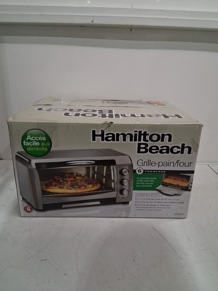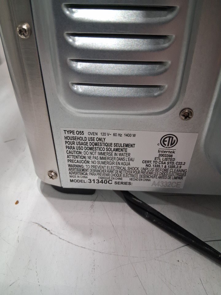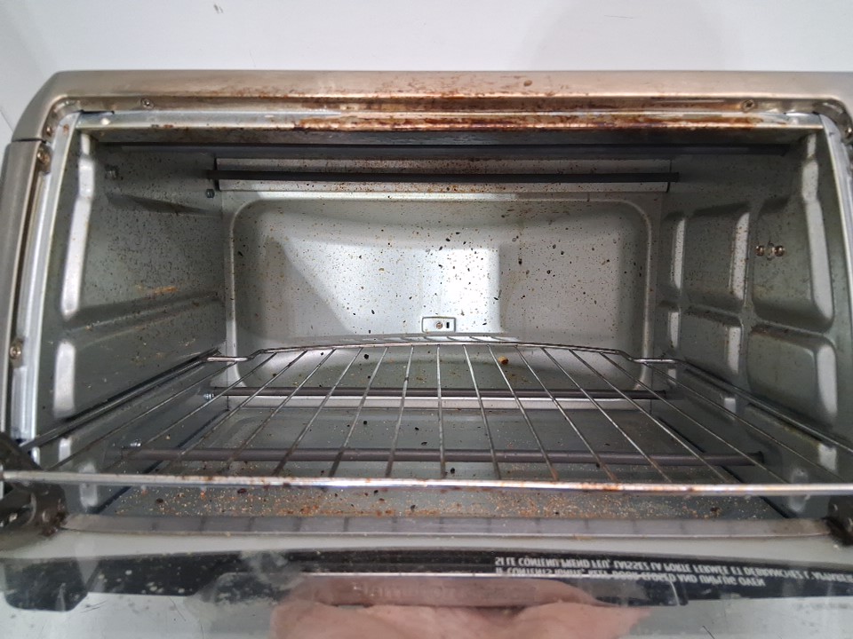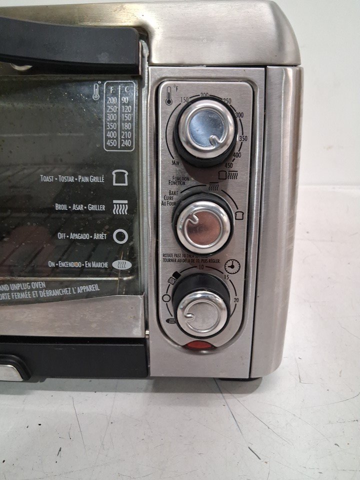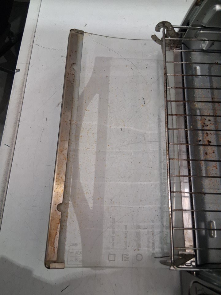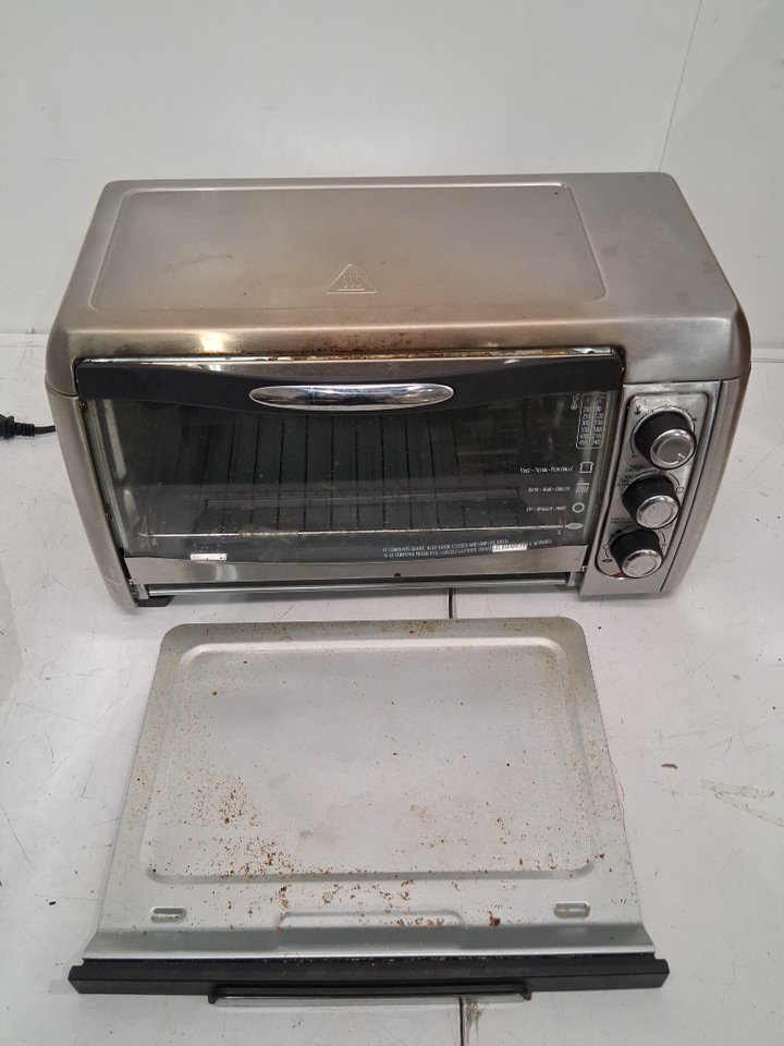 Both the tray and toaster oven show signs of heavy use. There are stains and crumbs from previous use in and on the toaster oven. Tested for power and function.