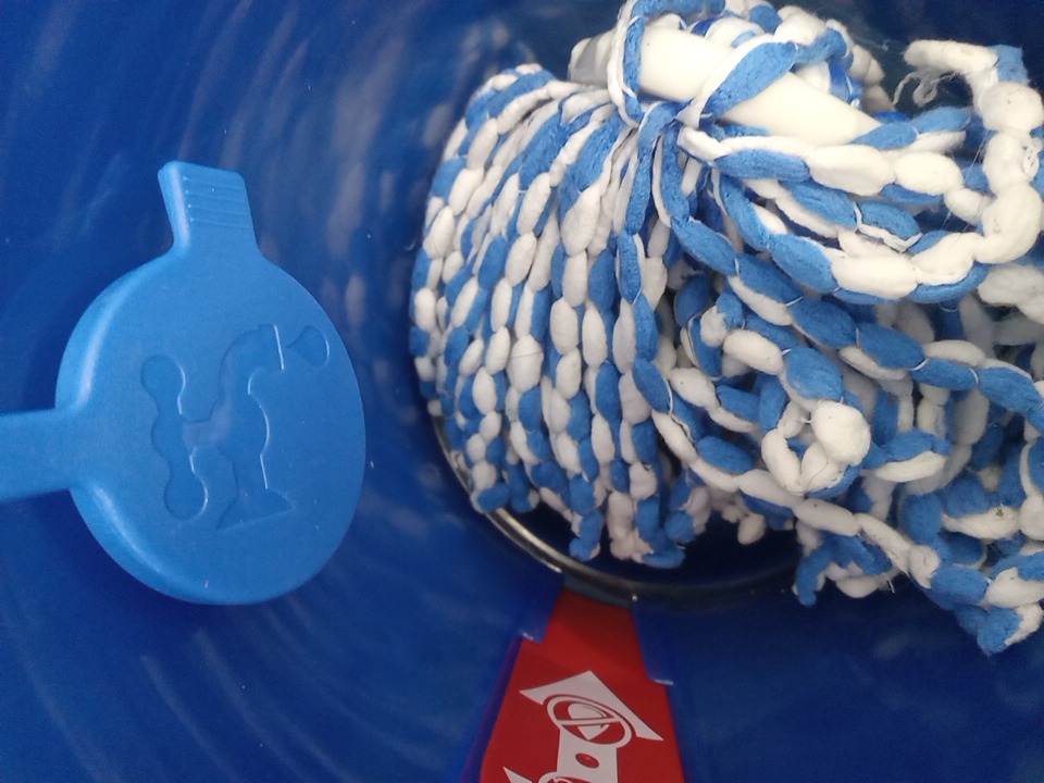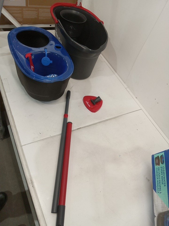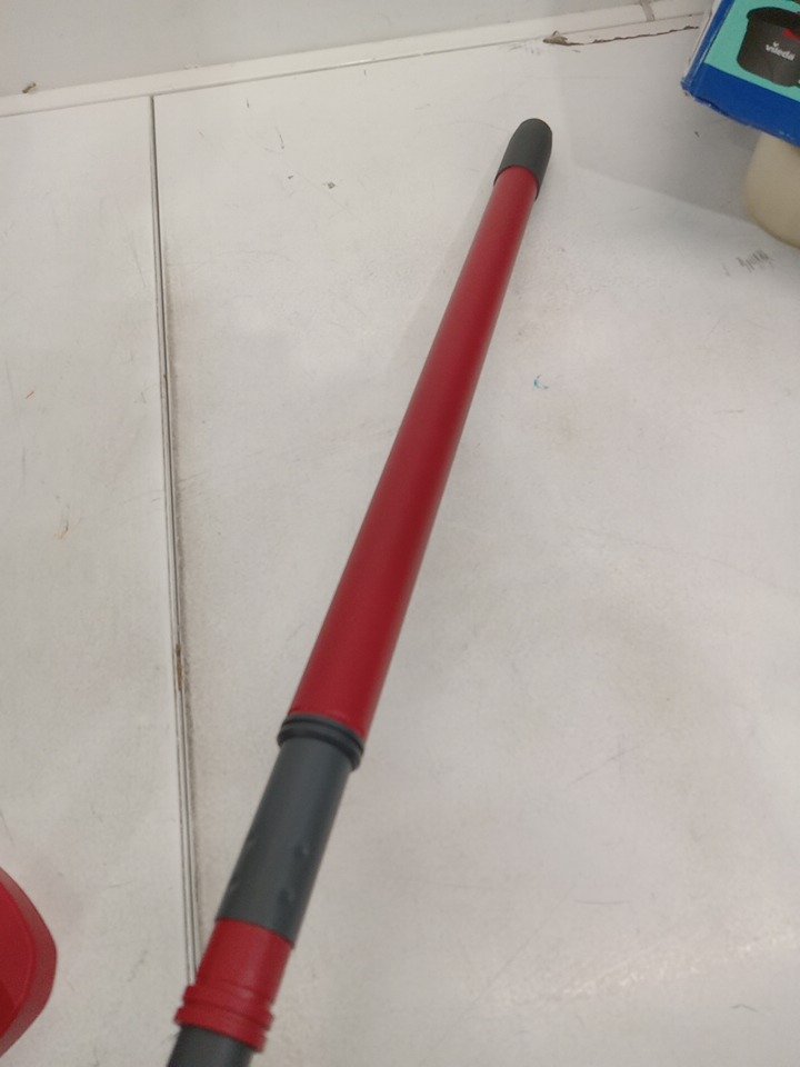 The red part of the handle does not seem to lock in, and some hairs present on the mop indicating prior use.