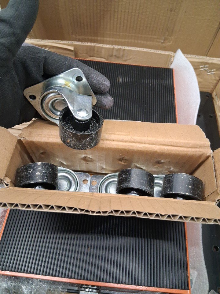 product has some markings on the bottom as well as some markings on the wheels from previous use (See photos)