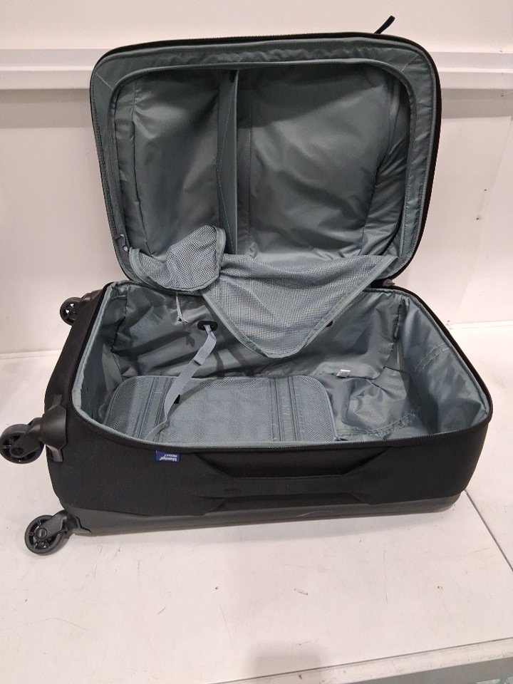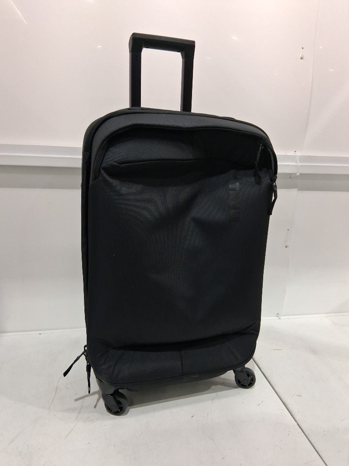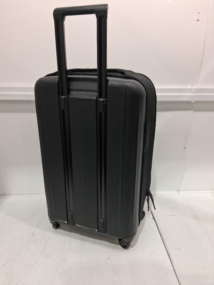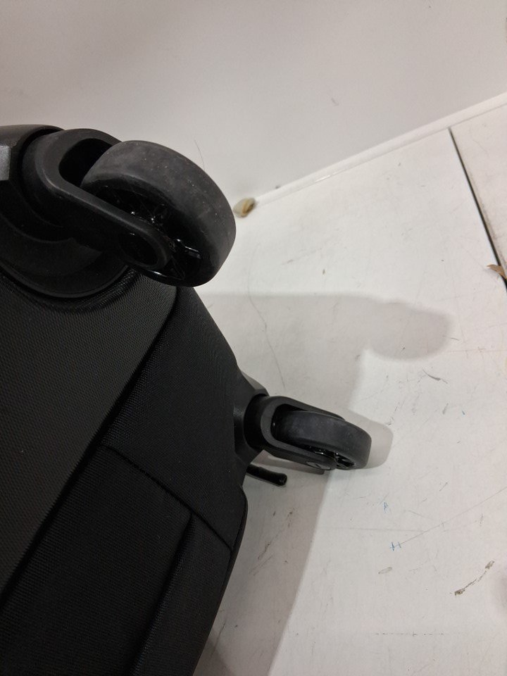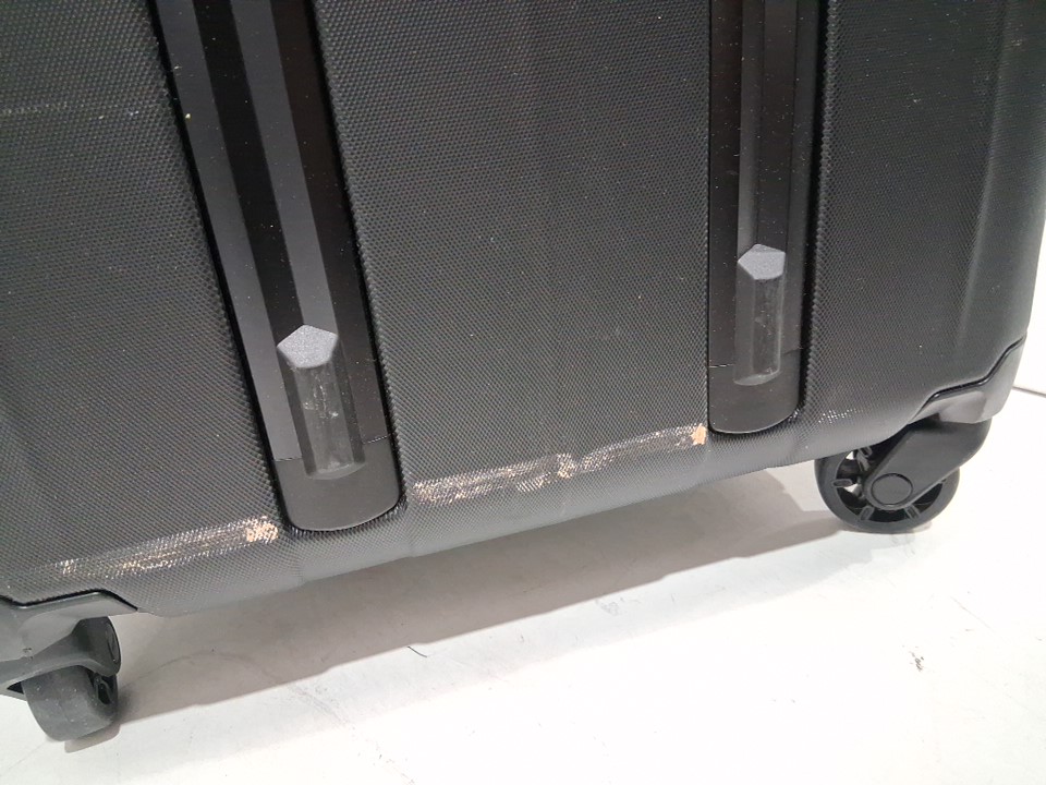 there is dirt on the wheels as well as some brown marks on the bottom of the luggage. scrapes present on the plastic areas.