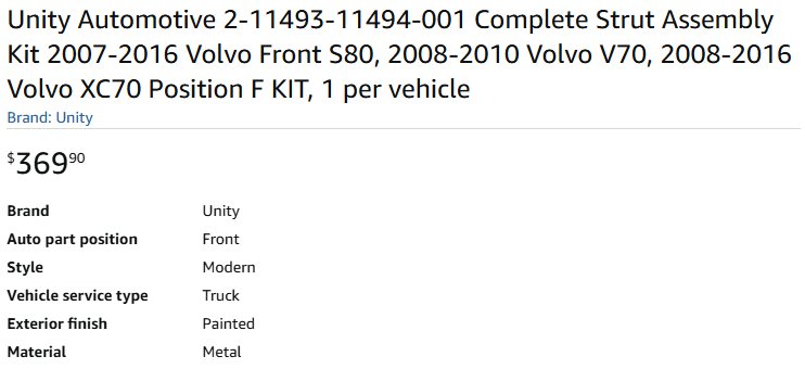 2PC UNITY AUTOMOTIVE Complete Strut Assembly FOR SELECT VOLVO MODELS - (MODEL: 11494 11493)