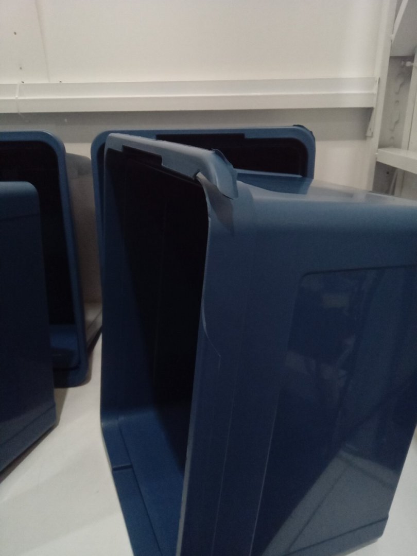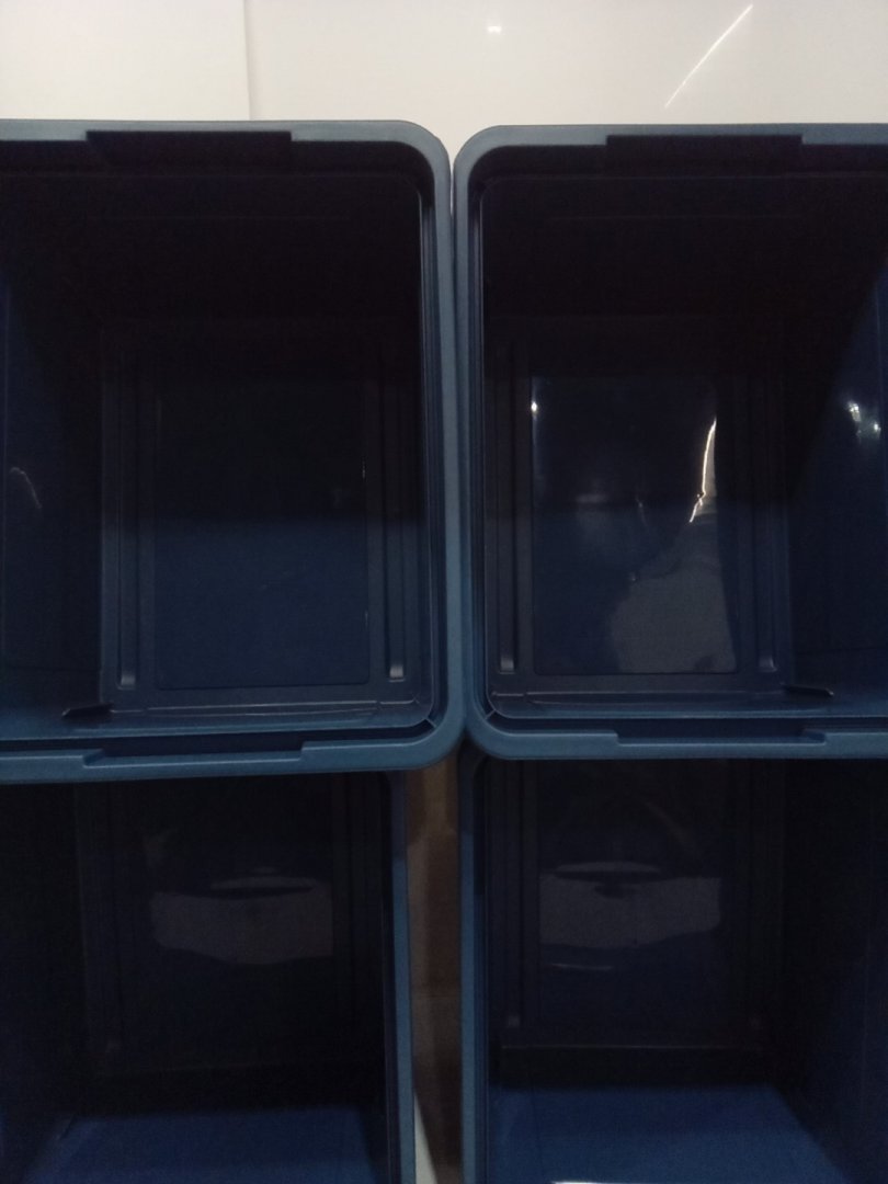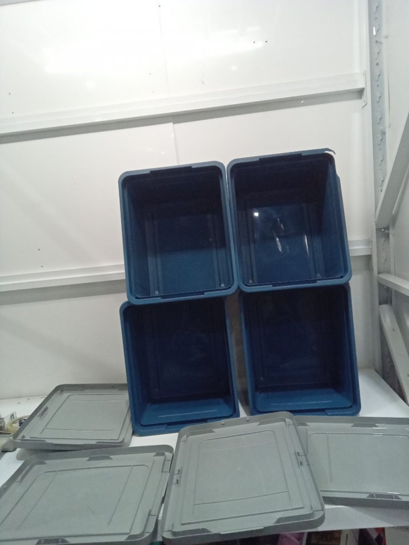 traces of dirt and some scuffs under one of the lids from prior use. one of the bins is damaged on the corner top edge, but lid can still sit on top of it. please see photos.