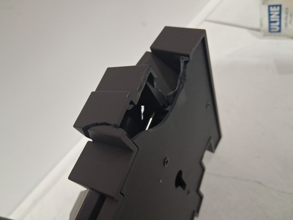 there is a crack on the back near the right corner, as well as a small bend in the hook rack appears it can still be wall mounted and used.