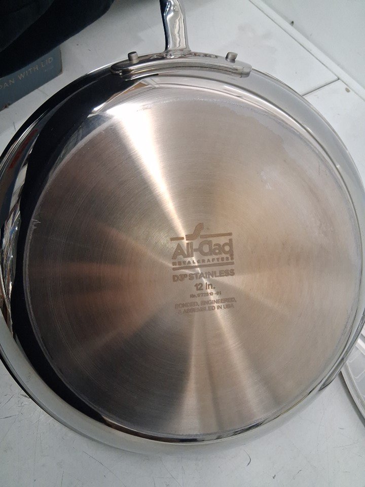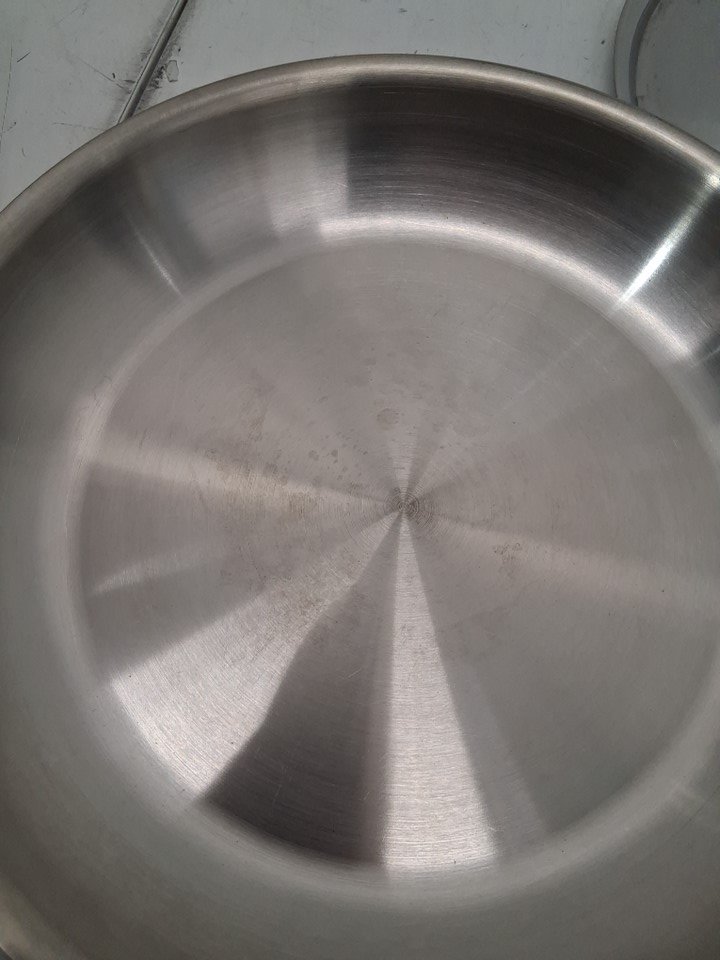 Frying pan and lid have visible water/food stains on them, bottom of pan has carbon discoloration
