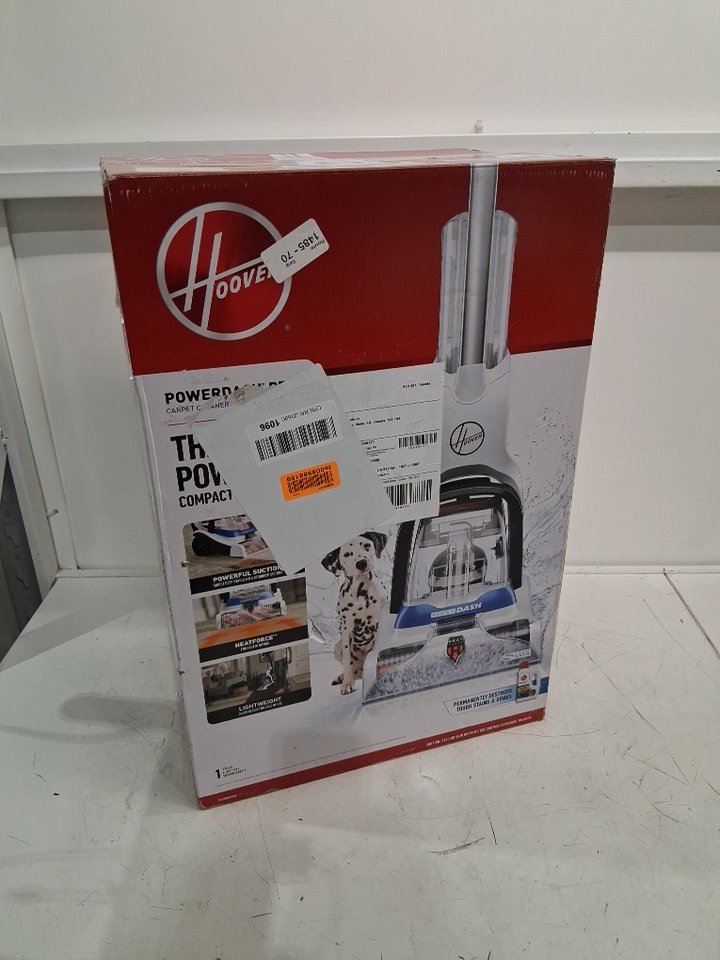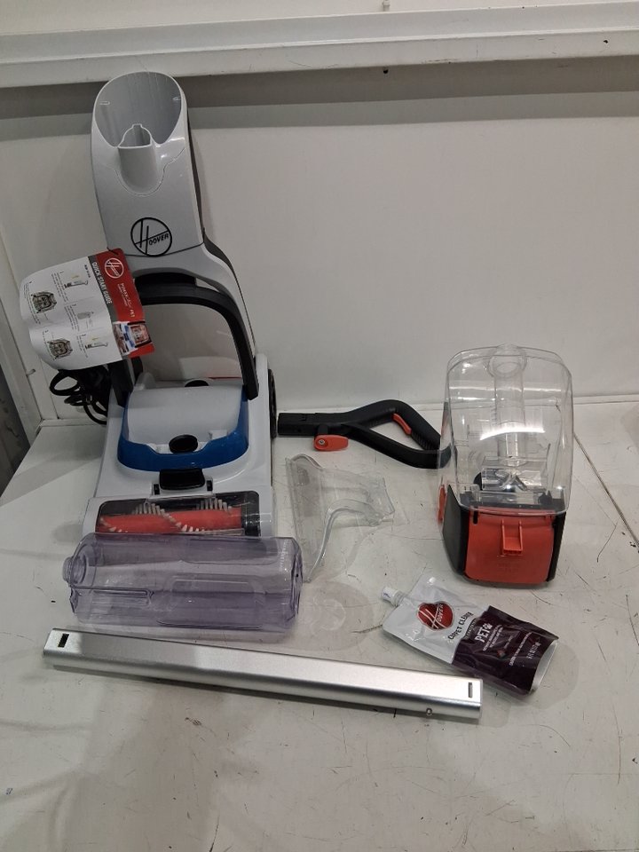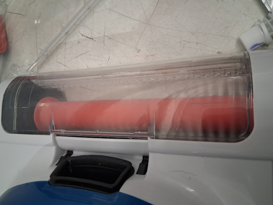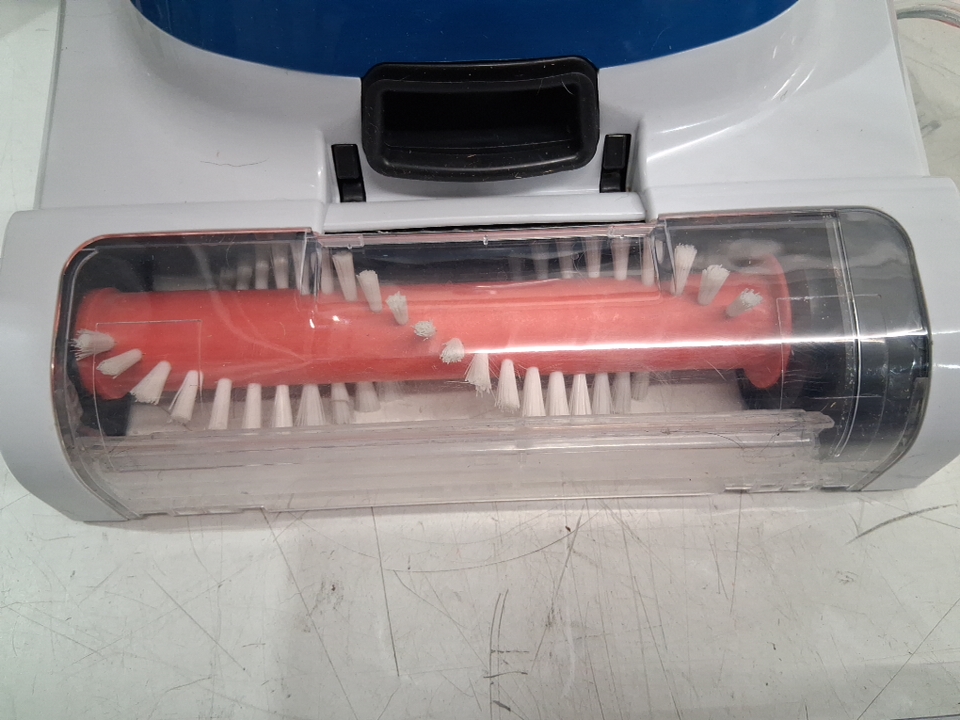 Tested for power. Please note: • The vacuum shows signs of previous use with dust inside the base, see photos. • The cleaning liquid container had been opened but is mostly full.