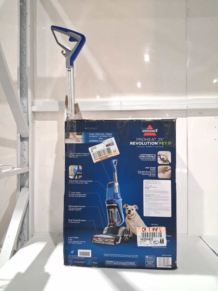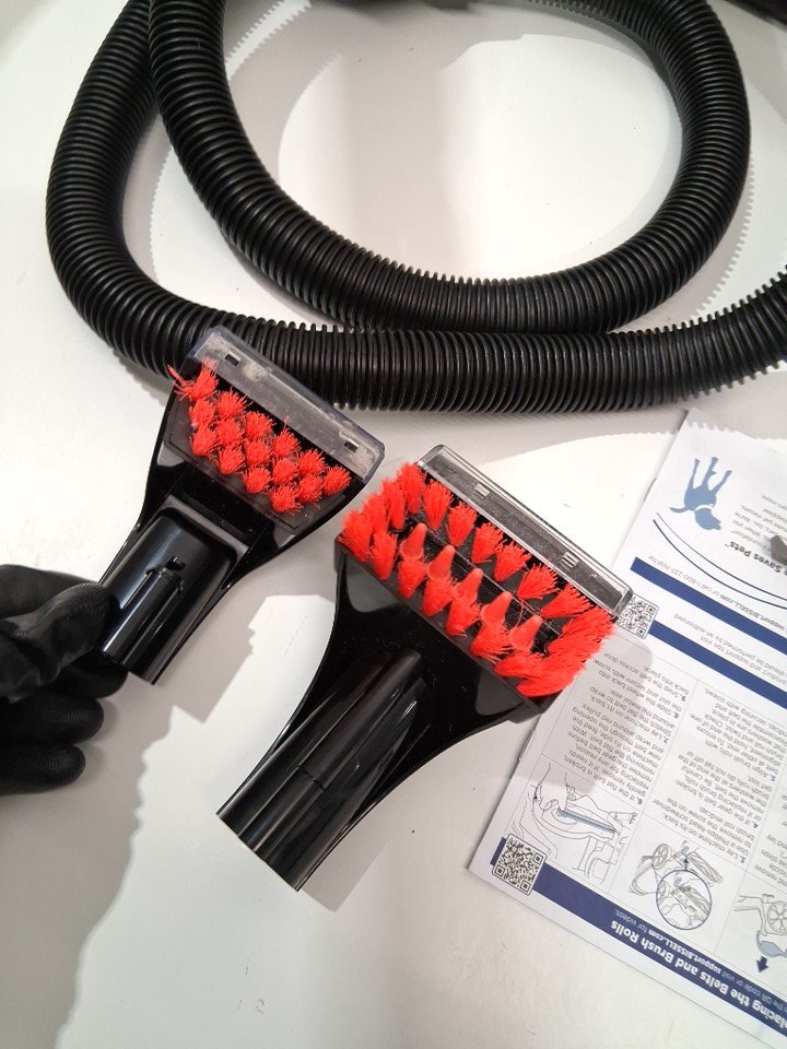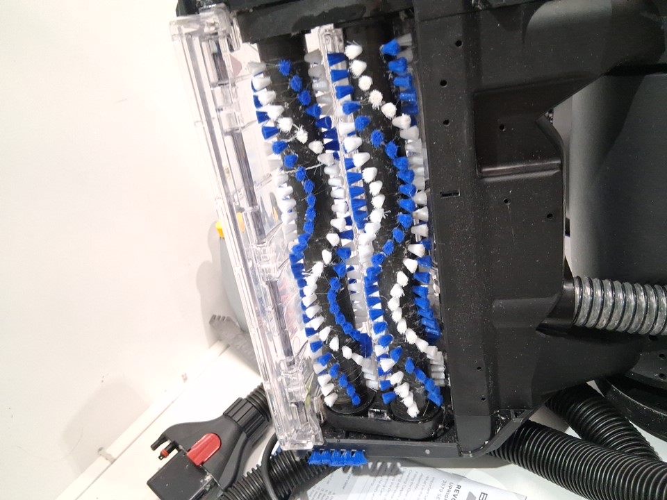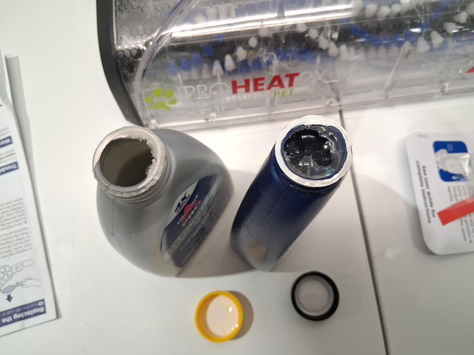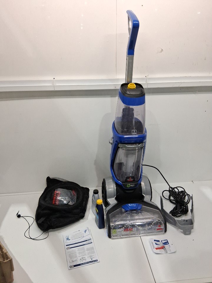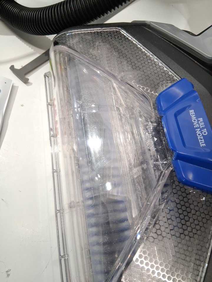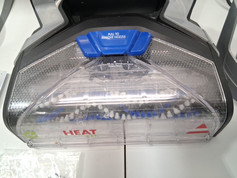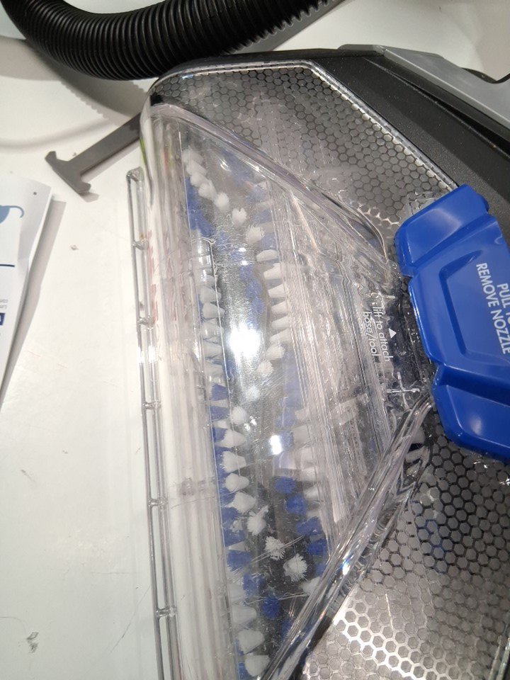 Handle is permanently attached to the base unit, as well both bottles have been opened and used but most solution remains. Light hairs/dirt on roller and tank has water droplets inside. Tested for power