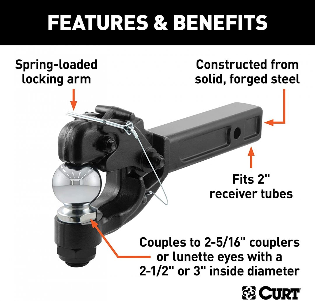 CURT RECEIVER-MOUNT BALL & PINTLE HITCH, 2" SHANK, 2-5/16" BALL, 12,000 LBS (MODEL: 48006)