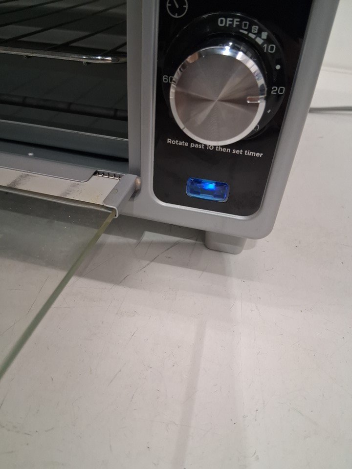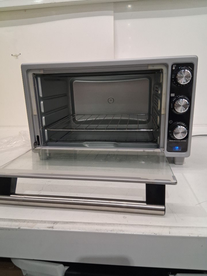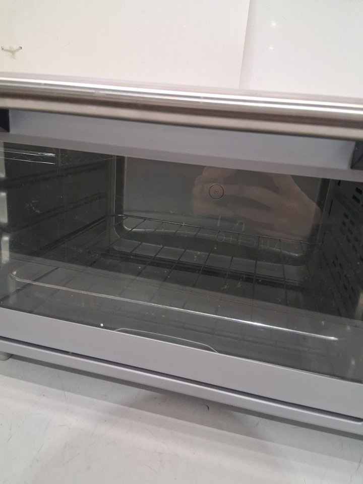 Toaster oven has visible food smudges on door, has been tested for power, however tray and basket are missing