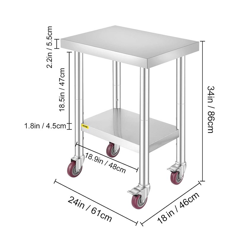 VEVOR WORK TABLE ON WHEELS, HEAVY DUTY STEEL CART WITH LOCKABLE WHEELS, 18" x 24" x 34" - STAINLESS STEEL